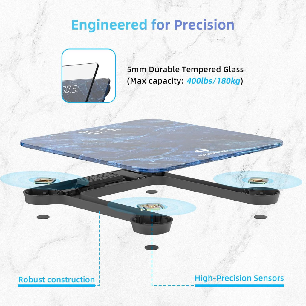 • Négy precíz szenzor: A mérleg 4 darab nagy pontosságú szenzorral van felszerelve, amely 0,1 kg (0,2 font) pontosságú méréseket biztosít