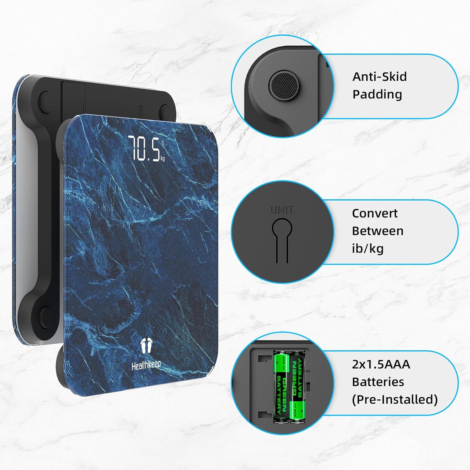 A Healthkeep digitális fürdőszobai mérleg a modern technológia és elegáns dizájn tökéletes kombinációja. Ez a kiváló minőségű mérleg 180 kg-ig terjedő súlykapacitással rendelkezik, így az egész család számára ideális megoldás. Az innovatív lépésre aktiválódó technológia garantálja, hogy másodpercek alatt pontos méréseket kapjon, anélkül hogy hosszú várakozási időre lenne szüksége. A márvány kék szín és vékony, elegáns kialakítás tökéletesen illeszkedik bármely fürdőszobai vagy hálószobai környezetbe.