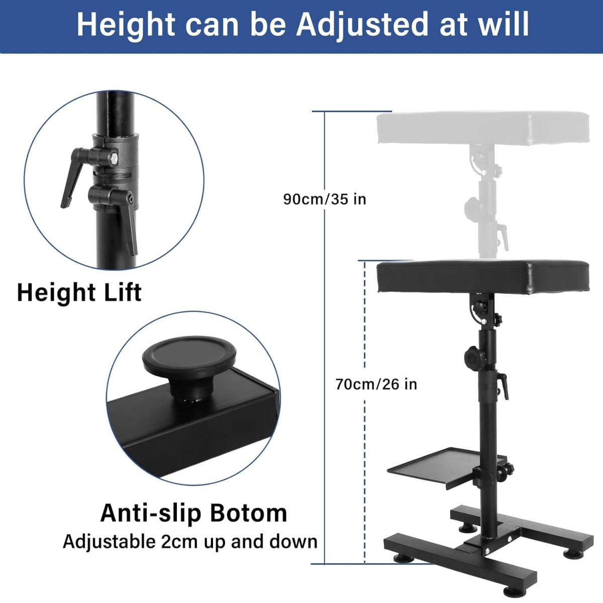 • Állítható magasság: 66-89 cm között szabadon állítható, így minden tetoválóművész megtalálhatja az ideális munkavégzési magasságot