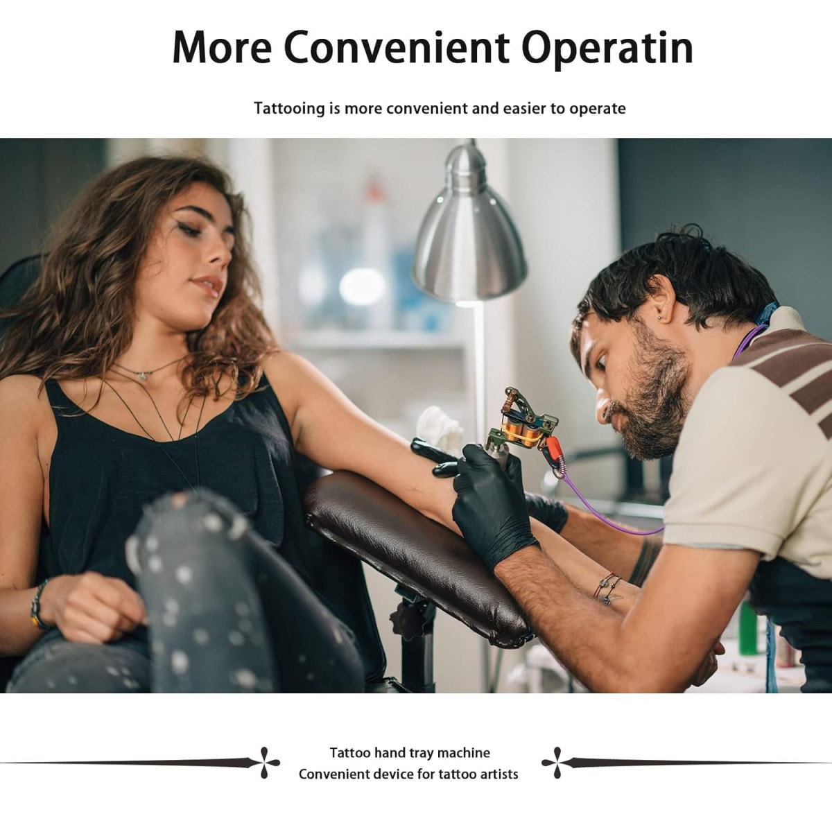 A termék univerzális kialakítása miatt kompatibilis minden tetoválóművész és szalon igényeivel. A karfej panel mérete 40 x 25 x 6,1 cm, amely elegendő felület biztosít a különféle testrészek támogatásához. Az állítható magasság (66-89 cm) szinte minden tetoválóművészt kielégít, függetlenül a testmagasságtól vagy a munkavégzési stílustól. A termék csomagolási mérete 41,29 x 30,9 x 19 cm, súlya pedig 4,48 kg, amely könnyű szállítást tesz lehetővé.