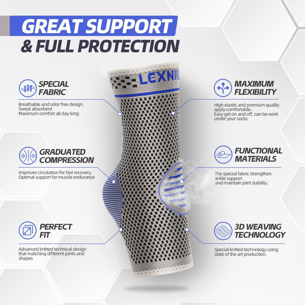 A Lexniush 2 darabos bokasúlyos támogatás professzionális szintű kompressziós megoldás, amely kifejezetten a bokasérülések, ínhüvelygyulladás és lúdtalp fájdalmainak enyhítésére tervezték. Az innovatív 3D kötéstechnológia és a magas minőségű anyagok kombinációja garantálja a maximális támogatást és kényelmet az egész nap során.
