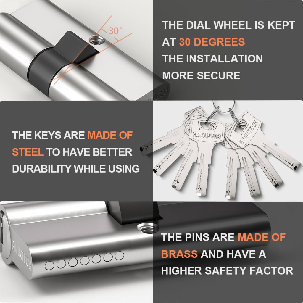 Celkovo je Bwintech 60mm (30/30) Niklovo-zinková zliatina Euro Vložka vynikajúcou voľbou pre každého, kto nechce robiť kompromisy v oblasti bezpečnosti svojho domova alebo kancelárie. Prémiové materiály, pokročilé bezpečnostné funkcie a užívateľsky prívetivý dizajn spoločne robia tento produkt výnimočným na trhu. 8 horizontálnych dôlkových kľúčov poskytuje dodatočnú bezpečnosť, zatiaľ čo jednoduchá inštalácia a hladký chod zámku zaručujú pohodlné používanie v každodennom živote.