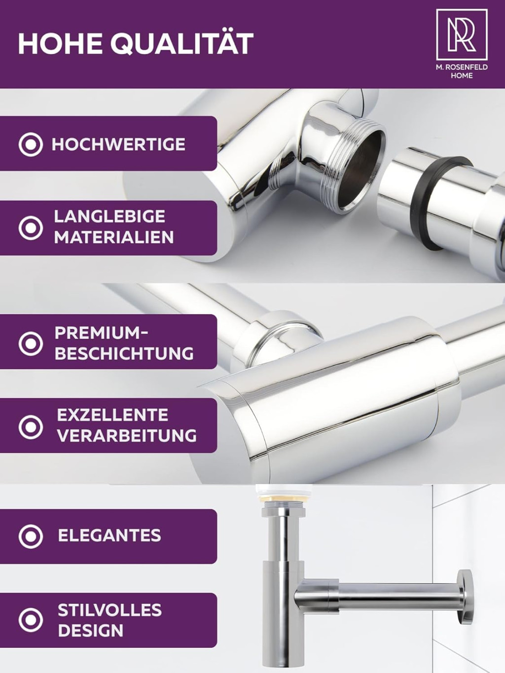 Sifón M. ROSENFELD HOME je kombináciou minimalistického dizajnu, nemeckej kvality a jednoduchej údržby. Tento produkt je perfektnou voľbou pre tých, ktorí si cenia štýl, spoľahlivosť a funkčnosť. Či už ide o rekonštrukciu kúpeľne, výmenu starého sifónu alebo novú inštaláciu, tento sifón splní všetky vaše požiadavky.