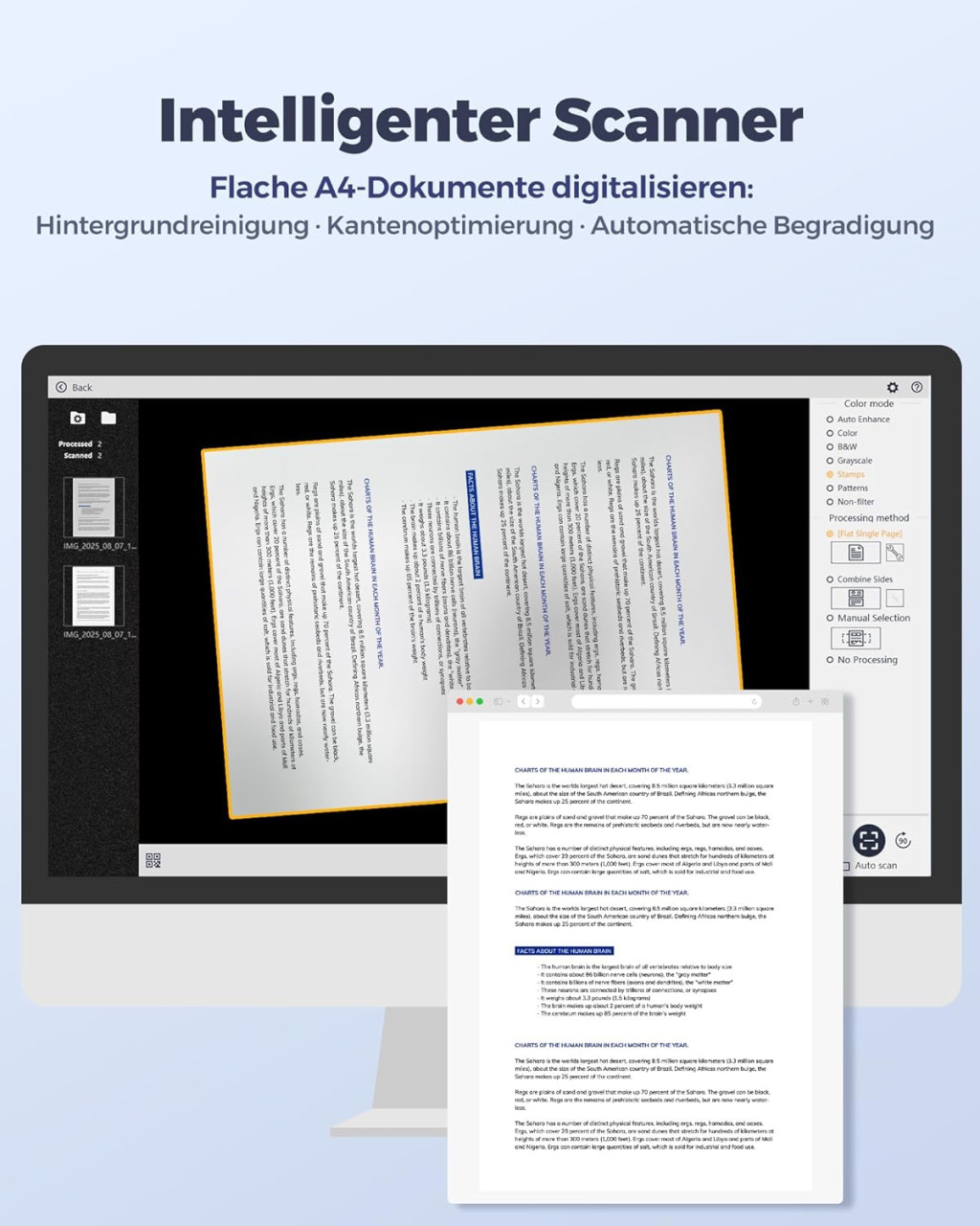 - Intelligens szoftver: Automatikus szövegirány-felismerés, háttértisztítás, képigazítás és többoldalas dokumentumok kombinálása