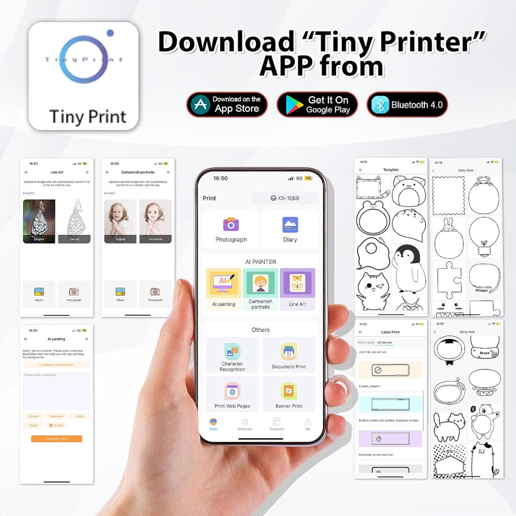 Tlačiareň je plne kompatibilná s operačnými systémami iOS a Android. Stiahnutie aplikácie z Apple App Store alebo Google Play Store je bezplatné. Pripojenie je jednoduché: stlačte a podržte tlačidlo napájania tlačiarne na 3 sekundy, zapnite funkciu Bluetooth na svojom smartfóne alebo tablete a vyberte zariadenie v aplikácii. Stav pripojenia môžete skontrolovať v ponuke "My Device".