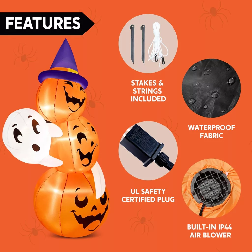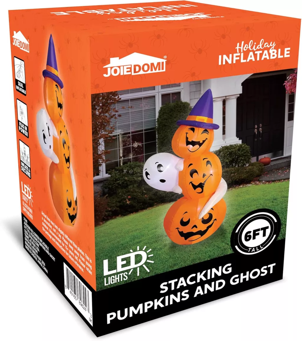 Nafukovacia halloweenska dekorácia Joiedomi s výškou 6 stôp je pôsobivá vonkajšia ozdoba, ktorá zaručene upúta pozornosť. Táto impozantná dekorácia pozostáva z troch na sebe naukladaných tekvíc a postavy ducha, ktorú zdobí čarodejnícky klobúk. Rozmery produktu sú 3,2 x 2,5 x 6 stôp, čo je ideálna veľkosť pre záhradu, dvor alebo vstup do domu. Elektrický systém s certifikáciou UL zaisťuje bezpečnosť, zatiaľ čo zabudované LED osvetlenie vytvára vo večerných hodinách úchvatný vizuálny efekt.