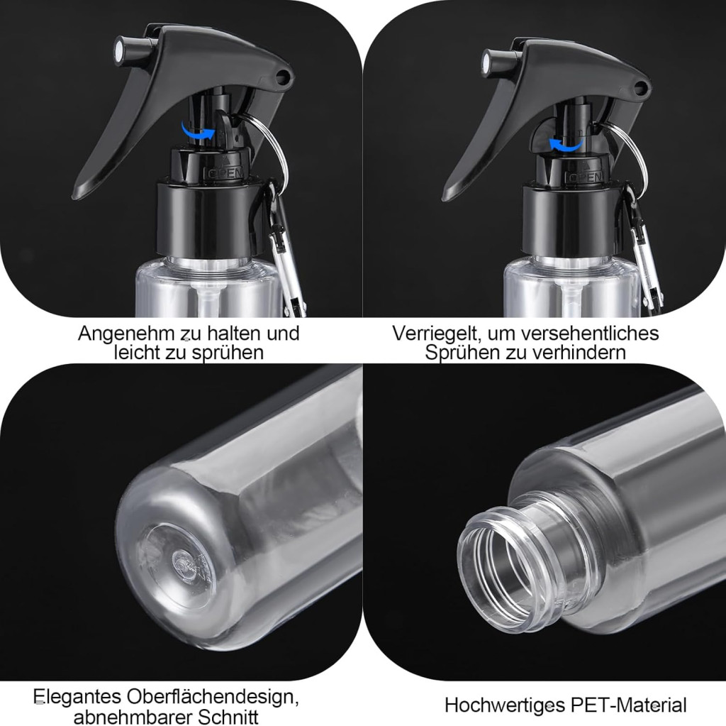 A PET anyag biztonságos, nem mérgező és tartós, így hosszú ideig használható. A karabiner rögzítés praktikus megoldást nyújt a hordozhatósághoz, míg a finom permetezés egyenletes folyadék elosztást biztosít. Mosogatógépben mosható, így a tisztítás egyszerű és gyors.