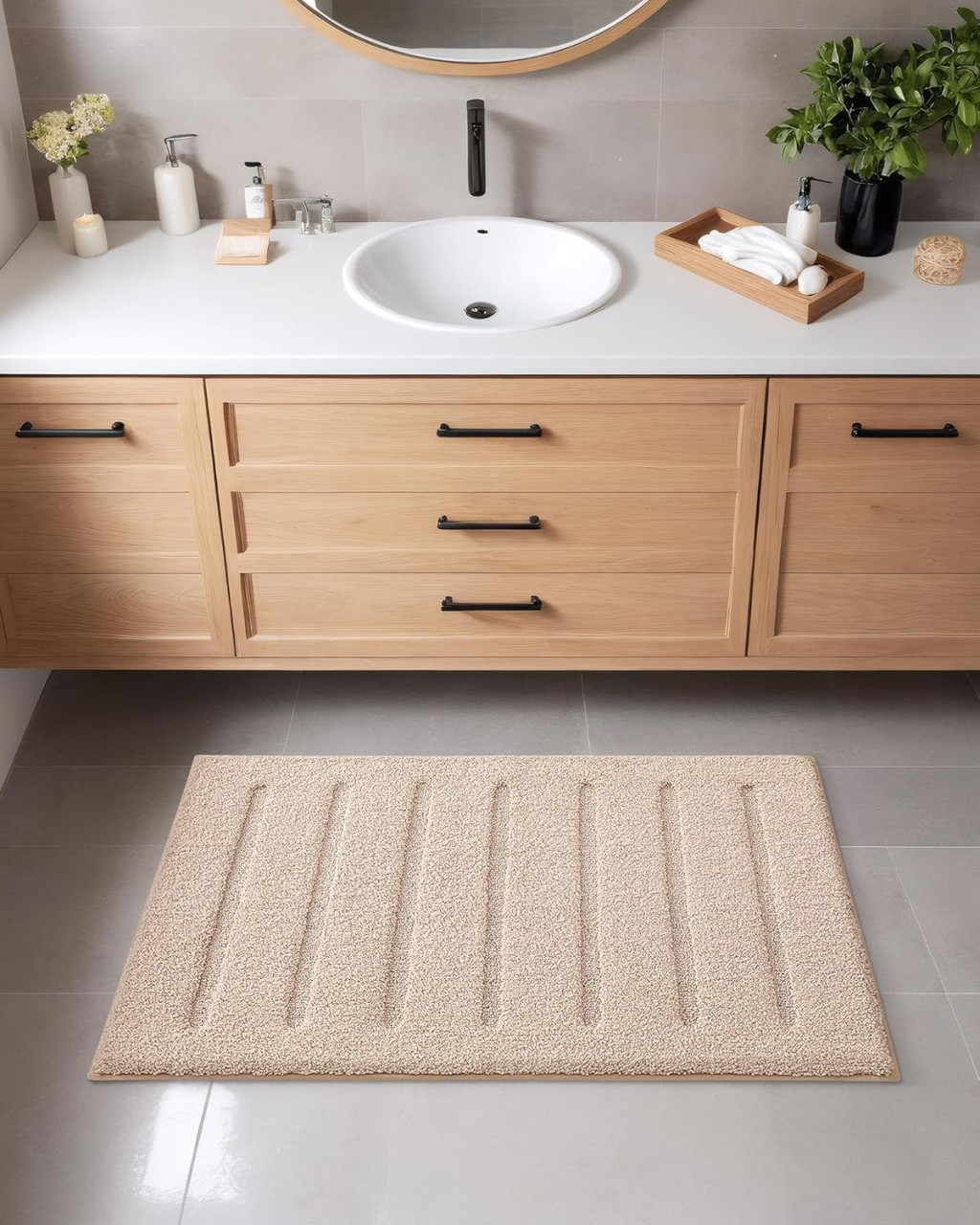 Kúpeľňová predložka COLOR&GEOMETRY je v domácnosti všestranne využiteľná. Je ideálnou voľbou pred vaňu, kde rýchlo pohltí kvapky vody. Je to perfektné riešenie aj pred sprchu, kde protišmyková vrstva zaisťuje bezpečnosť. Predložka skvele poslúži aj pri umývadle, kde sa počas každodennej rutiny zvykne hromadiť voda. Okrem toho ju môžete použiť v práčovni alebo iných vlhkých miestnostiach, kde potrebujete savú a protišmykovú podložku. Vďaka elegantnej béžovej farbe a 3D pruhovanému vzoru funguje aj ako dekoratívny prvok, ktorý vylepší vzhľad vašej kúpeľne.