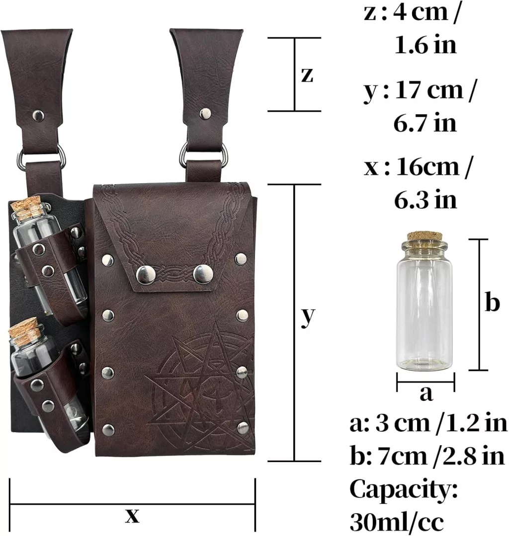 Taška z hnedej umelej kože je nielen pútavá, ale aj funkčná: v jej vonkajšej priehradke si môžete uložiť až 4 fľaštičky na elixíry s korkovými zátkami, takže svoje lektvary, elixíry alebo jedy budete mať vždy po ruke. Starostlivo prepracované detaily, vintage vzhľad a praktický dizajn robia z tejto tašky nepostrádateľnú súčasť pre každého fanúšika fantasy.