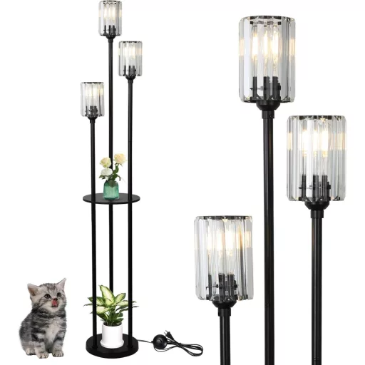 Moderná stojaca lampa Rayofly vytvára dokonalú rovnováhu medzi funkčnosťou a eleganciou. Táto čierna, 166 cm vysoká stojaca lampa nie je len svietidlo, ale aj štýlový kus nábytku. Tri K9 krištáľové tienidlá vytvoria vo vašej domácnosti jedinečnú hru svetla, zatiaľ čo vstavané police poskytujú praktický úložný priestor pre vaše obľúbené dekorácie. Minimalistický, moderný dizajn sa ľahko hodí do akéhokoľvek štýlu interiéru, či už ide o obývačku, spálňu alebo kancelárske prostredie. ✨