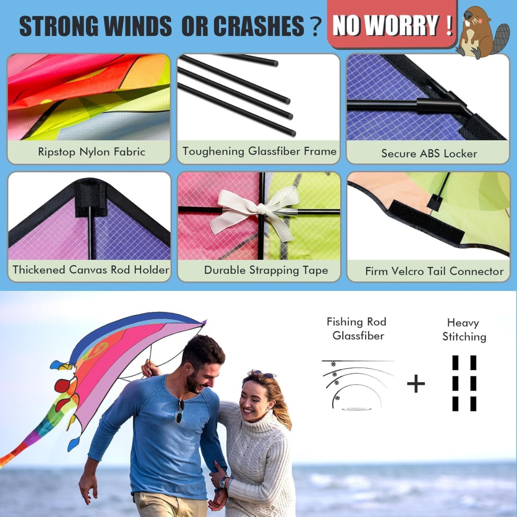 - Odolné materiály: Prúty zo sklolaminátu a pevné švy zaručujú, že šarkan odolá silnému vetru aj prípadným pádom.
