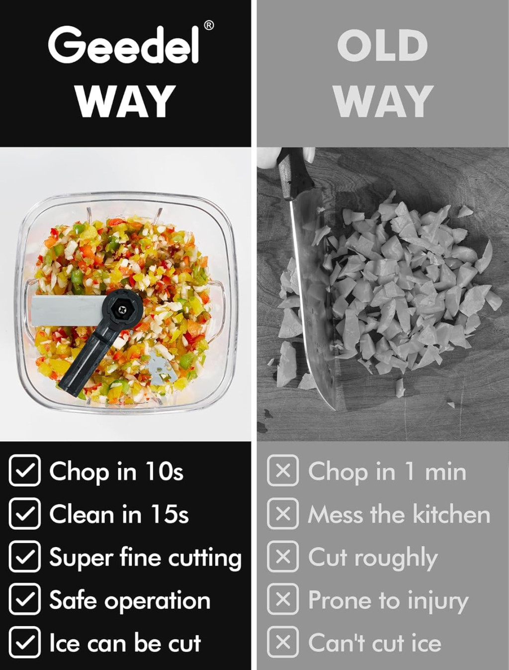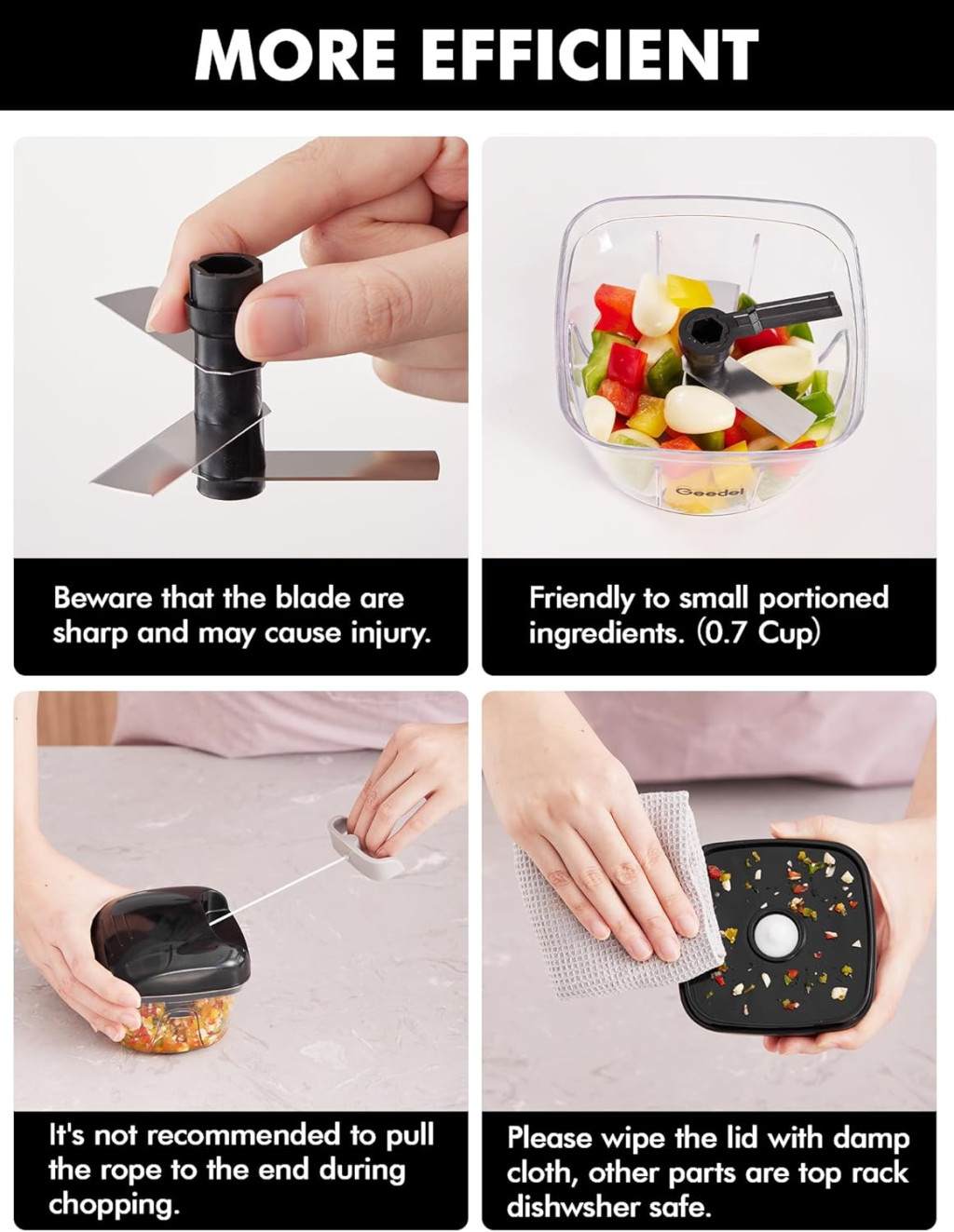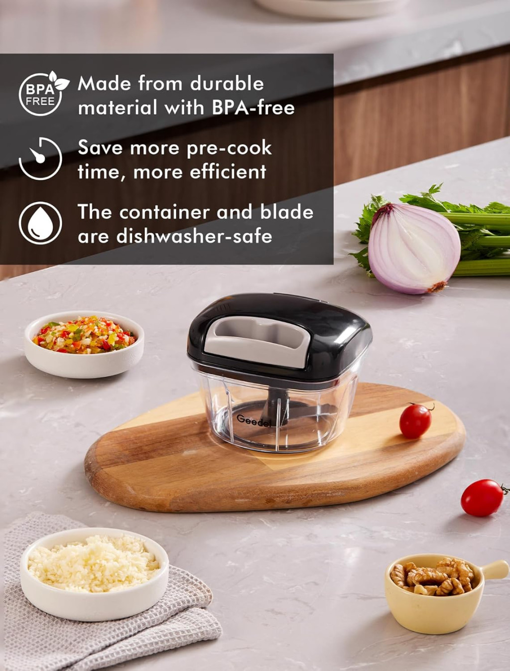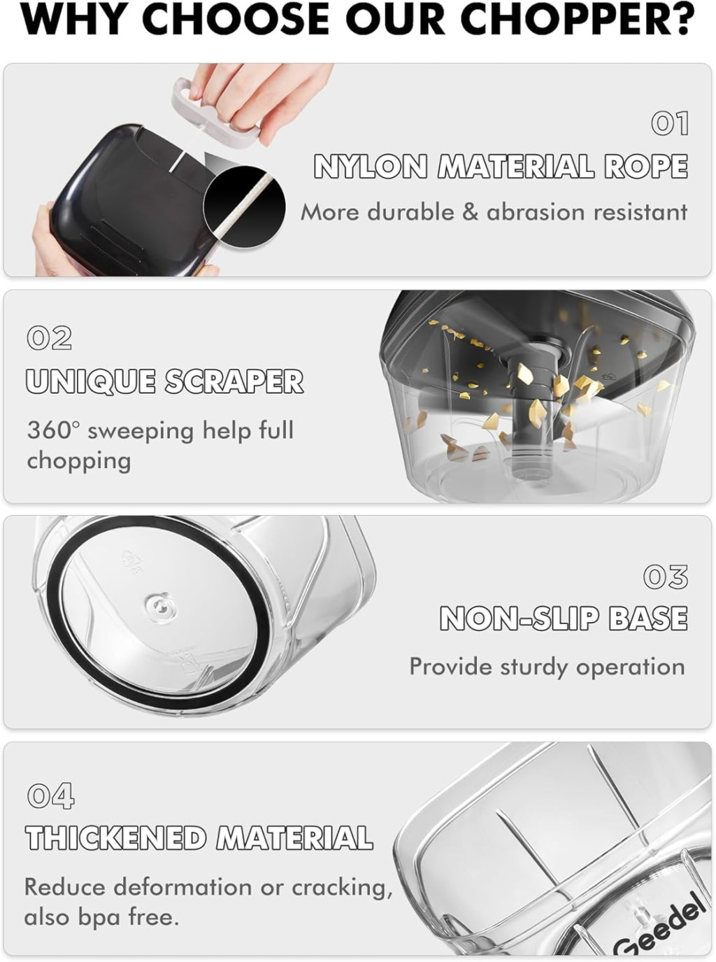Geedel má viac ako 26 rokov skúseností s výrobou kuchynských pomôcok. Tento sekáčik dokonale kombinuje funkčnosť, bezpečnosť a trvanlivosť. Priemerné hodnotenie zákazníkov 4.5 hviezdičky a viac ako 3 500 pozitívnych ohlasov svedčia o kvalite produktu.