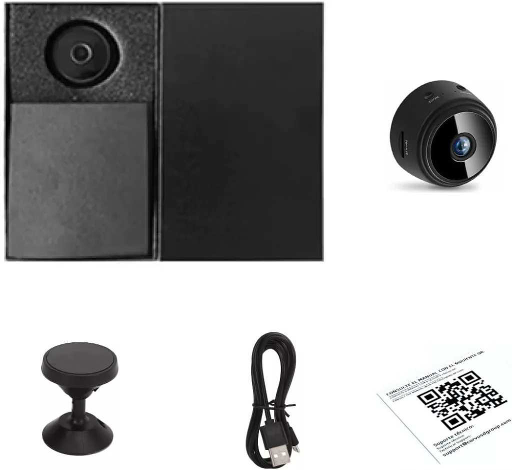 Csomag Tartalma: 1x Mini WiFi Kamera, 1x Mágneses Alap, 1x Articulált Állvány, 1x USB Töltőkábel, 1x Felhasználói Kézikönyv