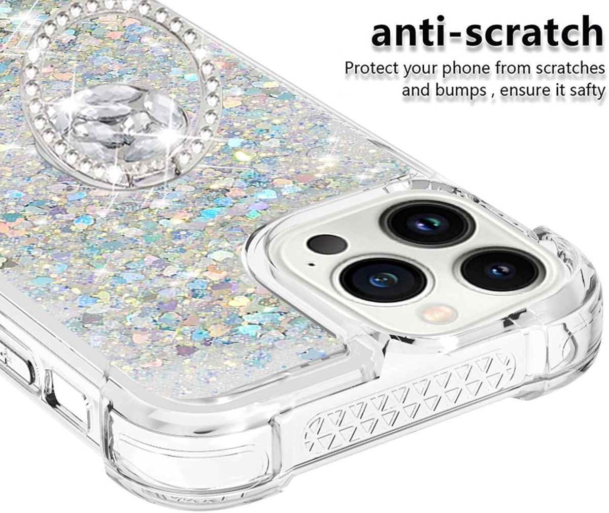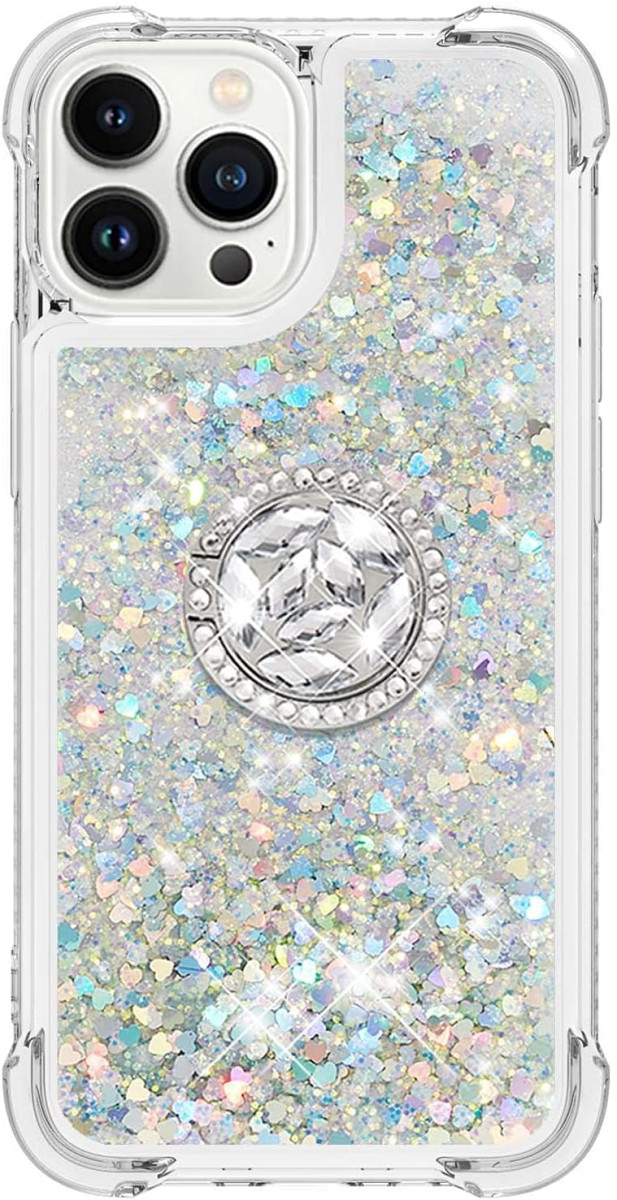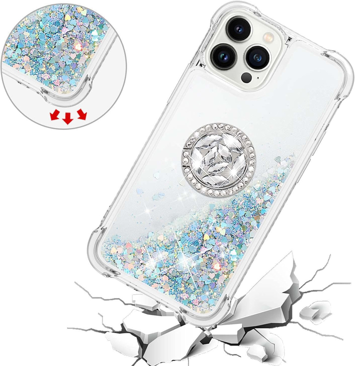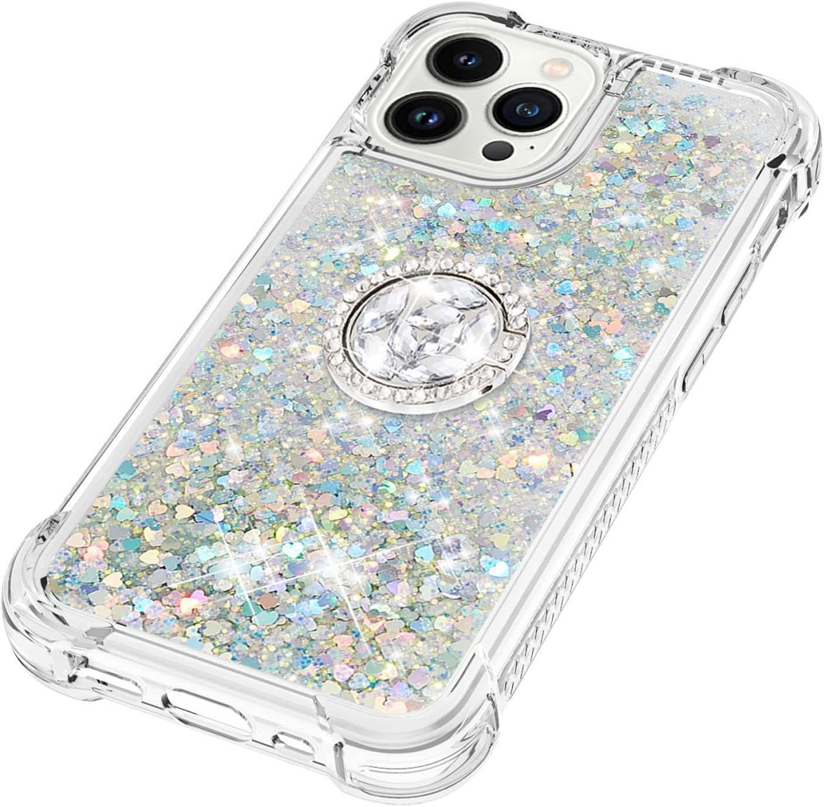 SIYOPINPFY Obal na iPhone 15 Pro s prstencom a stojanom – Priehľadný silikónový trblietavý tekutý ochranný kryt pre ženy, strieborný