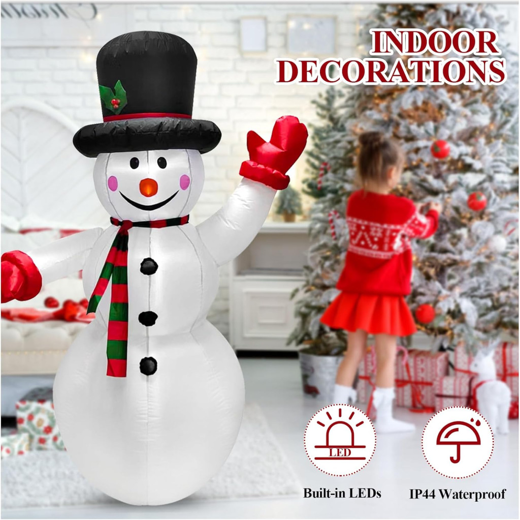 Vitajte vo svete vianočnej dekorácie! Tento 1,8 metra vysoký nafukovací snehuliak je perfektnou voľbou, ak chcete vytvoriť priateľskú, veselú vianočnú atmosféru vo vašom domove alebo záhrade. Jeho milý úsmev, červené líčka a elegantný čierny klobúk si zaručene získajú srdcia vašej rodiny aj hostí. Vďaka 3 vstavaným LED svetlám poskytuje magický vzhľad aj po zotmení, ktorý je viditeľný z diaľky a skutočne pôsobivý.