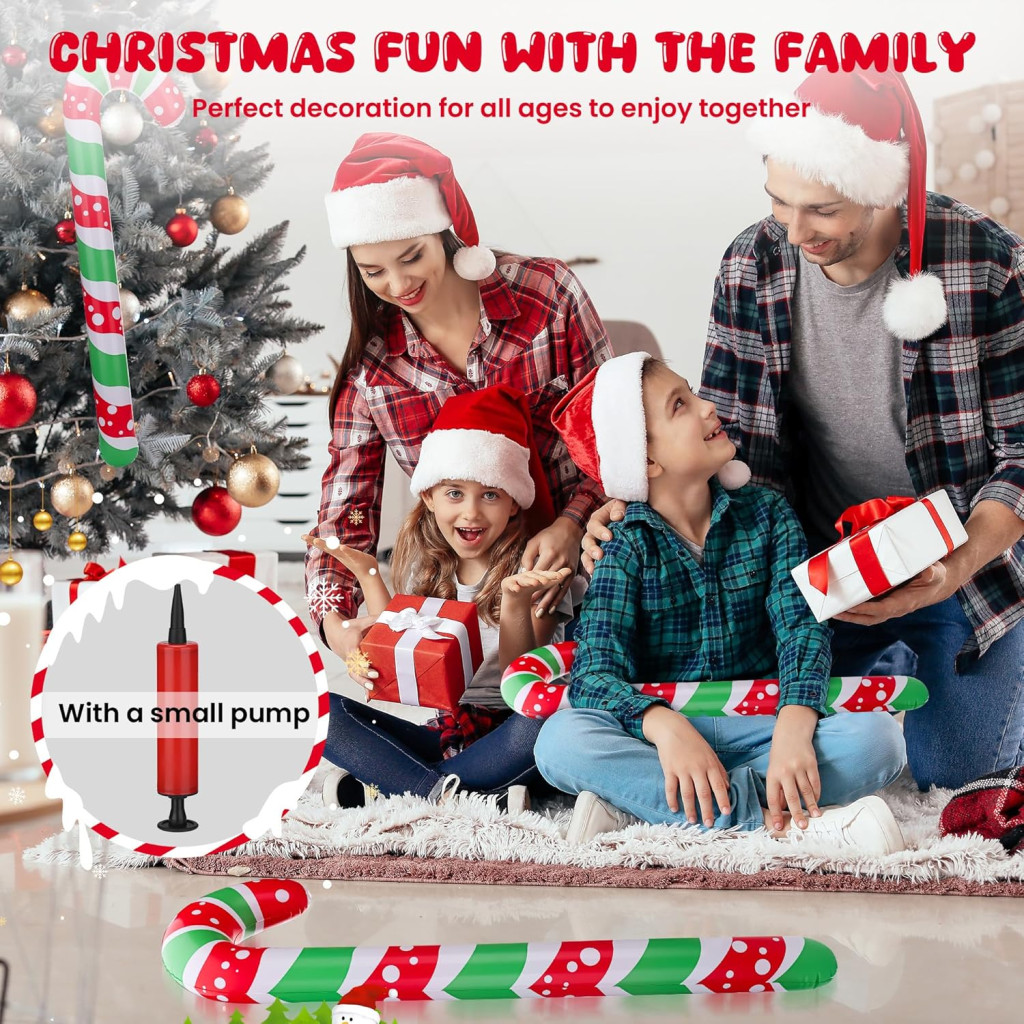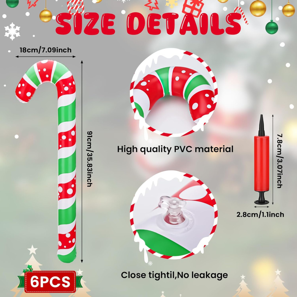 Táto 6-dielna sada nafukovacích vianočných dekorácií v tvare cukroviniek je dokonalou voľbou pre každého, kto chce svoj domov alebo akciu naplniť sviatočnou atmosférou. Nafukovacie tvary v XXL veľkosti 91 centimetrov prichádzajú v klasických červených, bielych a zelených farbách, ktoré zaručene upútajú pozornosť. Súčasťou balenia je aj praktická vzduchová pumpa, ktorá umožňuje rýchle a jednoduché nafúknutie.