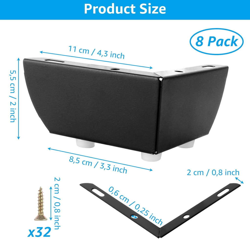 A bútor lábak univerzális csatlakozási pontokkal rendelkeznek, amelyek szinte minden bútor típussal kompatibilisek. A csomag 32 darab csavart tartalmaz, amely elegendő az összes 8 láb biztonságos rögzítéséhez. A telepítés egyszerű és gyors, nem szükséges speciális szerszám vagy szakértelem.