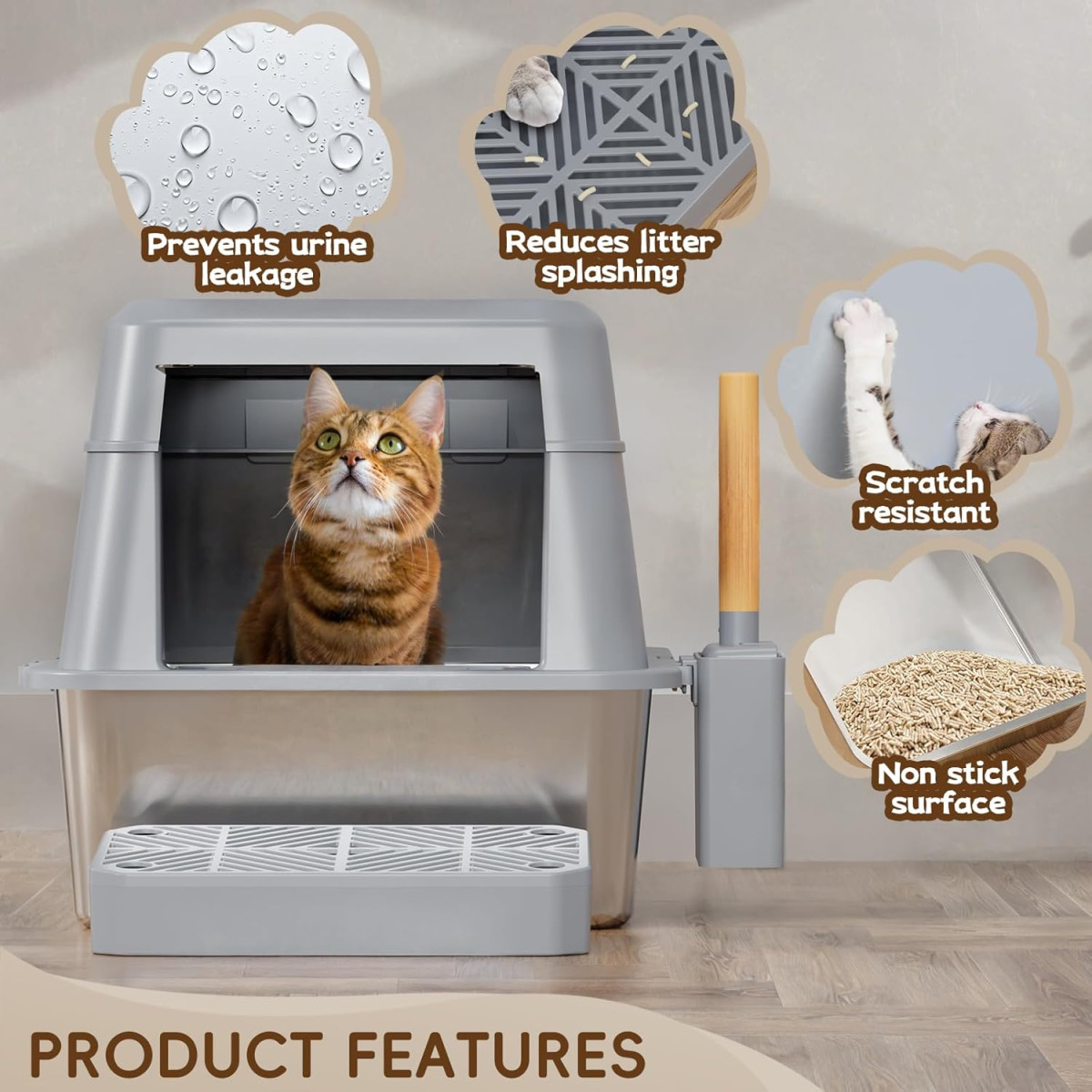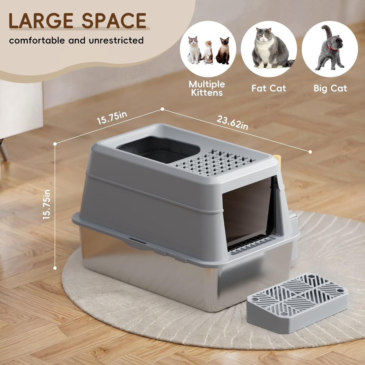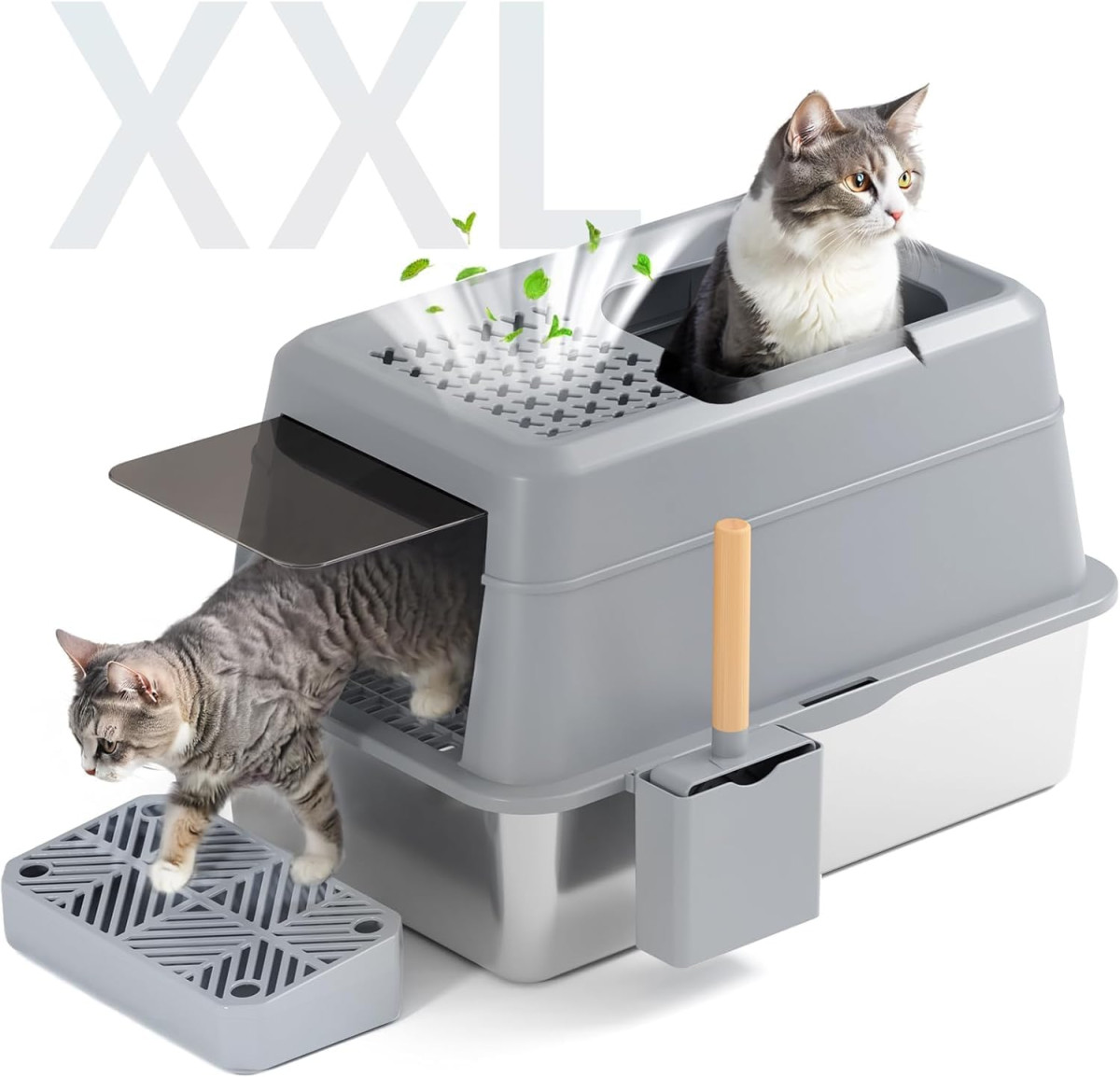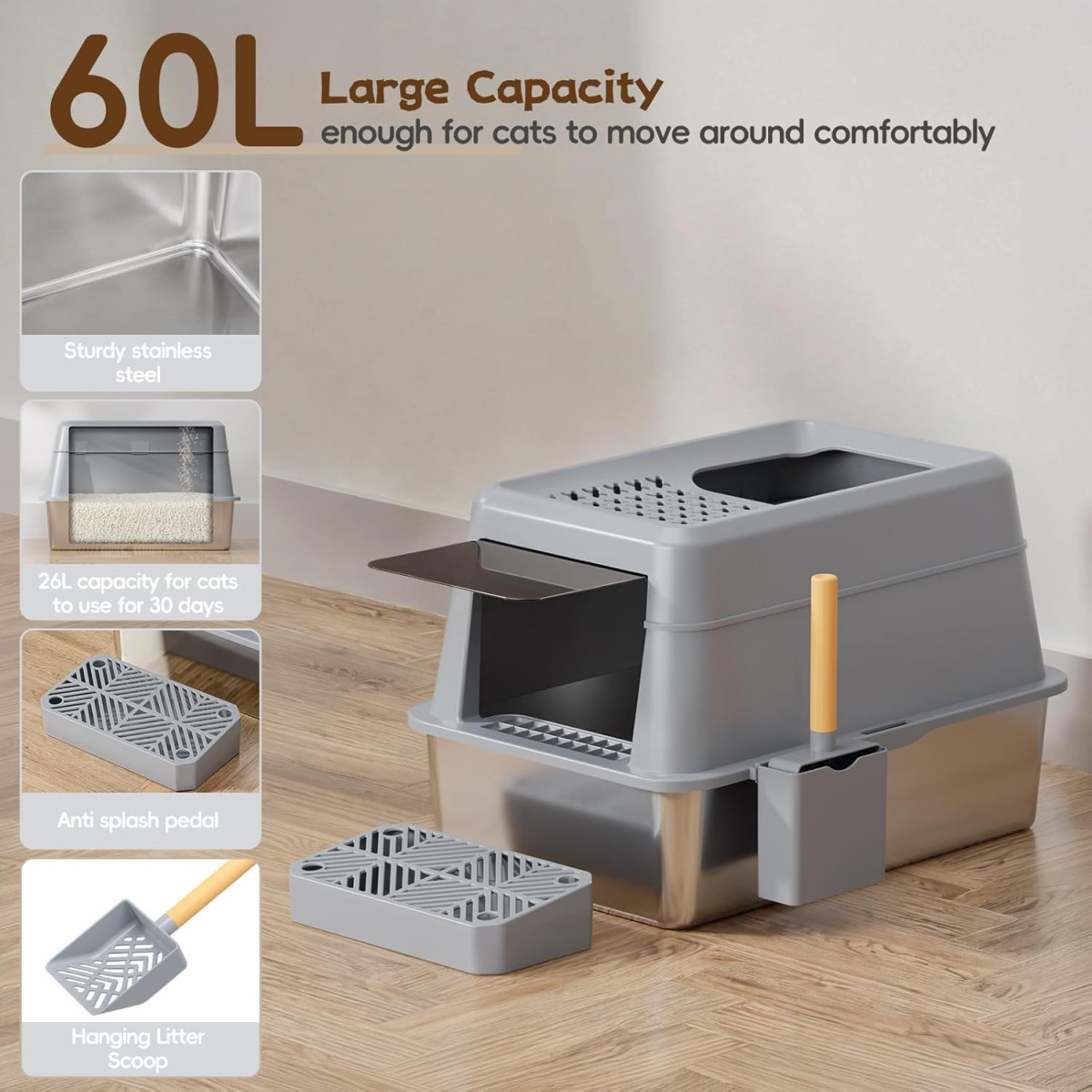 Ez az XXL macskavécé a modern macskavéce-megoldások csúcsa, amely ötvözi a funkcionalitást, a tartósságot és az elegáns dizájnt. A 60 x 40 x 40 cm-es méretei biztosítják, hogy még a nagyobb macskák is kényelmesen használhassák, míg a 26 literes kapacitás azt jelenti, hogy akár 30 napig is elhagyhatod otthonod anélkül, hogy aggódnál a tisztítás miatt. A rozsdamentes acél 304-es típusa garantálja a hosszú élettartamot és az ellenállást a macskakarmok okozta karcolásokkal szemben.