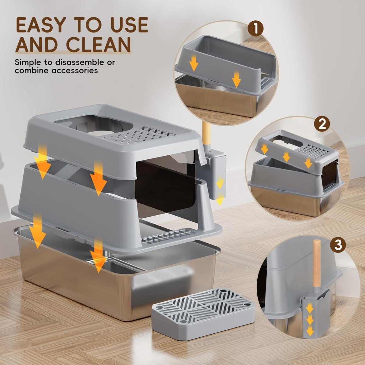 A macskavécé egyszerűen összeállítható a patentcsatos kialakításnak köszönhetően. Nem szükséges szerszám, mindent kézzel lehet szerelni és szétszerelni. A szett tartalmazza az összes szükséges alkatrészt, beleértve a fa nyéllel ellátott műanyag lapátot, amely a vécé oldalára akasztható a könnyű hozzáférés és helytakarékosság érdekében.