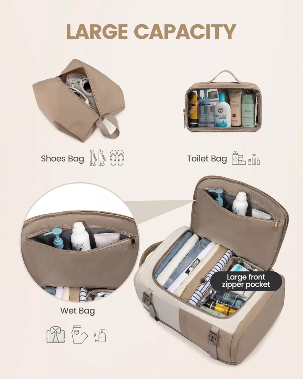 Priložená taška na obuv a kozmetická taštička umožňujú dokonalú organizáciu a viaceré spôsoby nosenia zaisťujú potrebnú flexibilitu. Či už ho používate ako batoh, príručnú tašku alebo ho pripevníte na kufor, táto taška je vždy správnou voľbou.