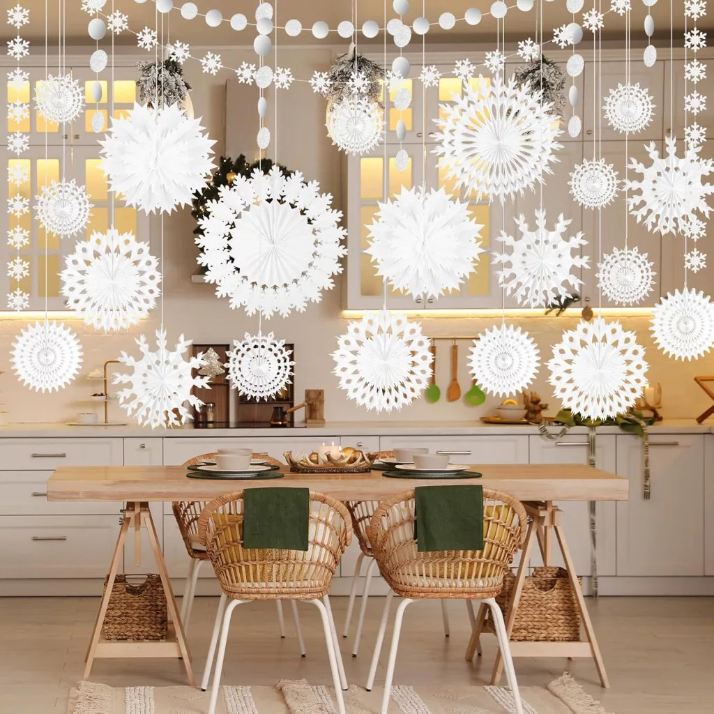 - Bohatý obsah súpravy: 10 papierových vejárov v tvare bielej snehovej vločky, 1 girlanda s motívom snehových vločiek, 1 girlanda so striebornými bodkami, 30 metrov závesnej šnúrky a lepiace body