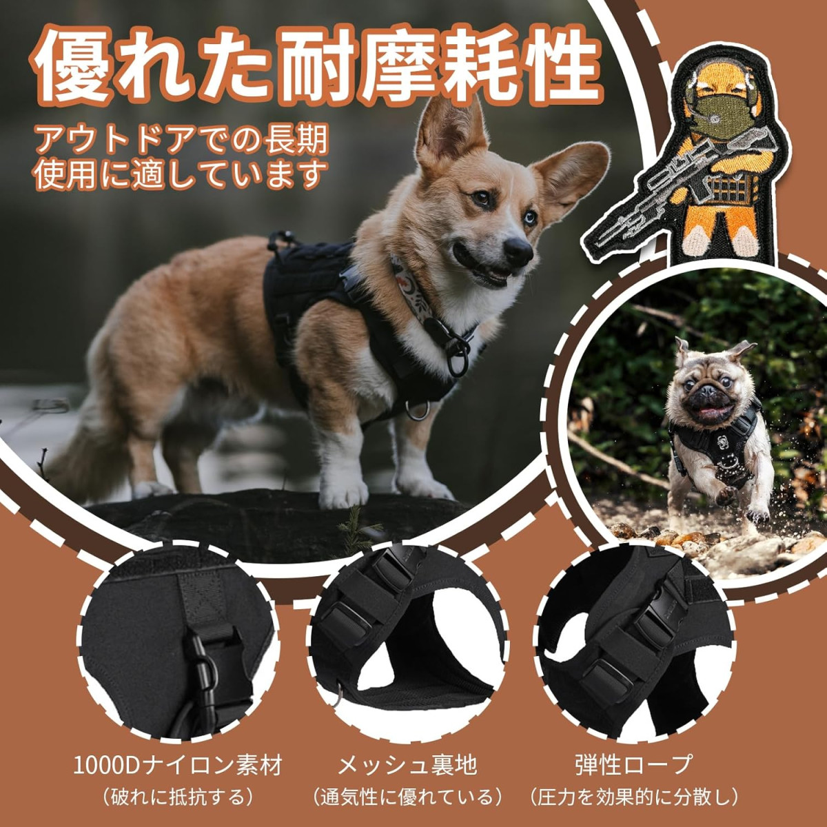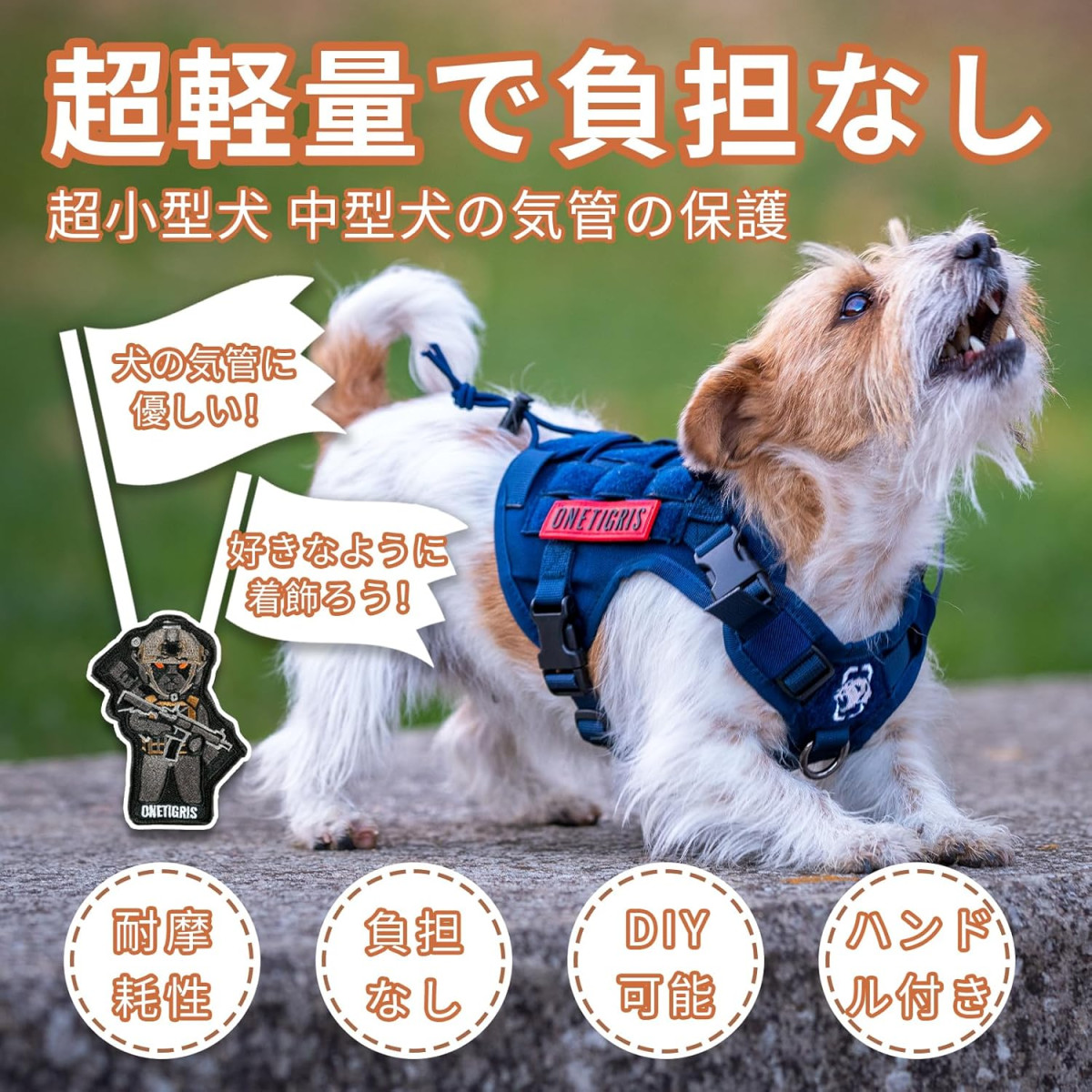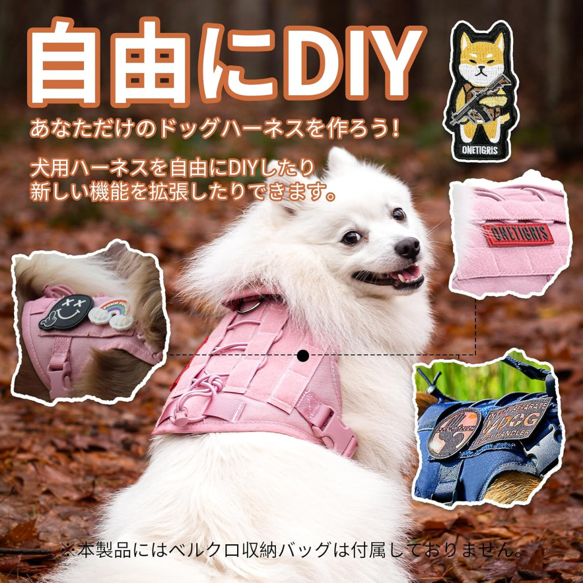 MOLLE kompatibilita umožňuje pripevnenie mnohých doplnkov, ako sú vrecká na maškrty, pomôcky na venčenie a iné taktické vybavenie. Systém X-bungee zabezpečuje pružné a bezpečné upevnenie nášiviek.