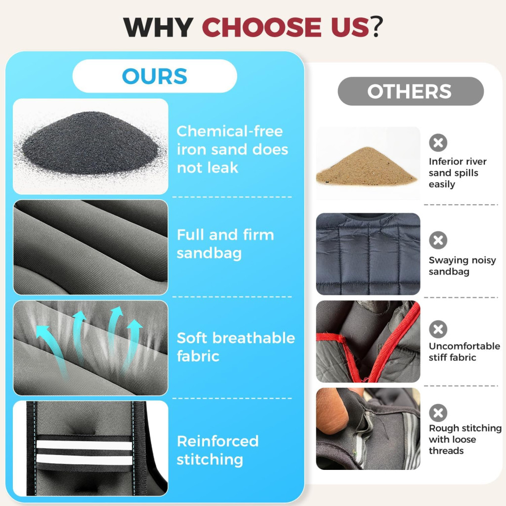 Vasmaggal töltött vs. homokkal töltött: A vasmaggal töltött mellények egyenletes súlyeloszlást biztosítanak, míg a homokkal töltöttek hajlamosak az egyenlőtlen eloszlásra.