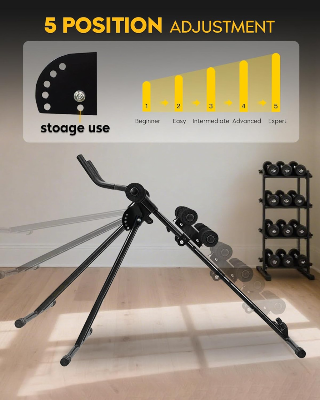 Az összecsukható kialakítás lehetővé teszi, hogy az edzőgépet könnyedén tárolhassa az ágy alatt, a kanapé mellett vagy a szobák sarkában. Mindössze 80 x 40 cm helyet foglal el összecsukva, így még a legkisebb lakásokba is beilleszthető. Férfiak és nők egyaránt használhatják, függetlenül a fitneszszintjüktől.