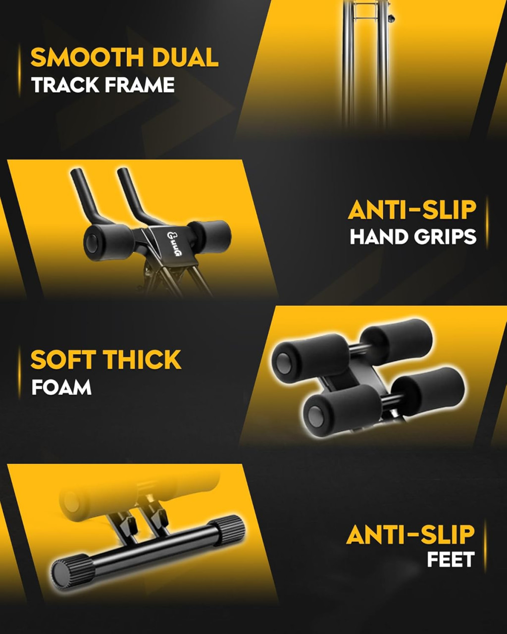 A GUUG hasizom tréner 120 kg maximális terhelhetőséggel rendelkezik, amely biztosítja, hogy szinte bárki biztonságosan használhassa. Az eszköz erős acélvázzal és kettős sín rendszerrel van felszerelve, amely extra stabilitást és támogatást nyújt a hagyományos egysín kialakítással szemben.