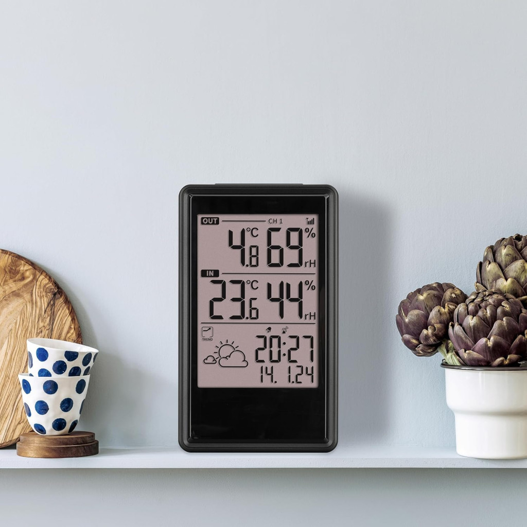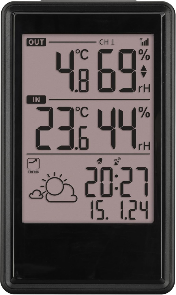 Bezdrôtová meteostanica TFA Dostmann ETNA je moderné a praktické riešenie pre tých, ktorí majú radi jednoduchosť a zameranie na to podstatné. Táto digitálna meteostanica prehľadne zobrazuje vonkajšiu a vnútornú teplotu a vlhkosť vzduchu, pričom poskytuje predpoveď počasia na 6 – 12 hodín pomocou symbolov a šípok trendu. Zariadenie funguje aj ako rádiom riadené hodiny s presným zobrazením dátumu a časového pásma, a disponuje vstavaným budíkom s funkciou odloženého budenia.