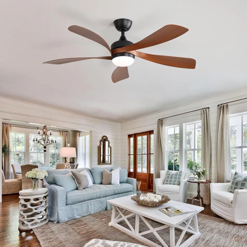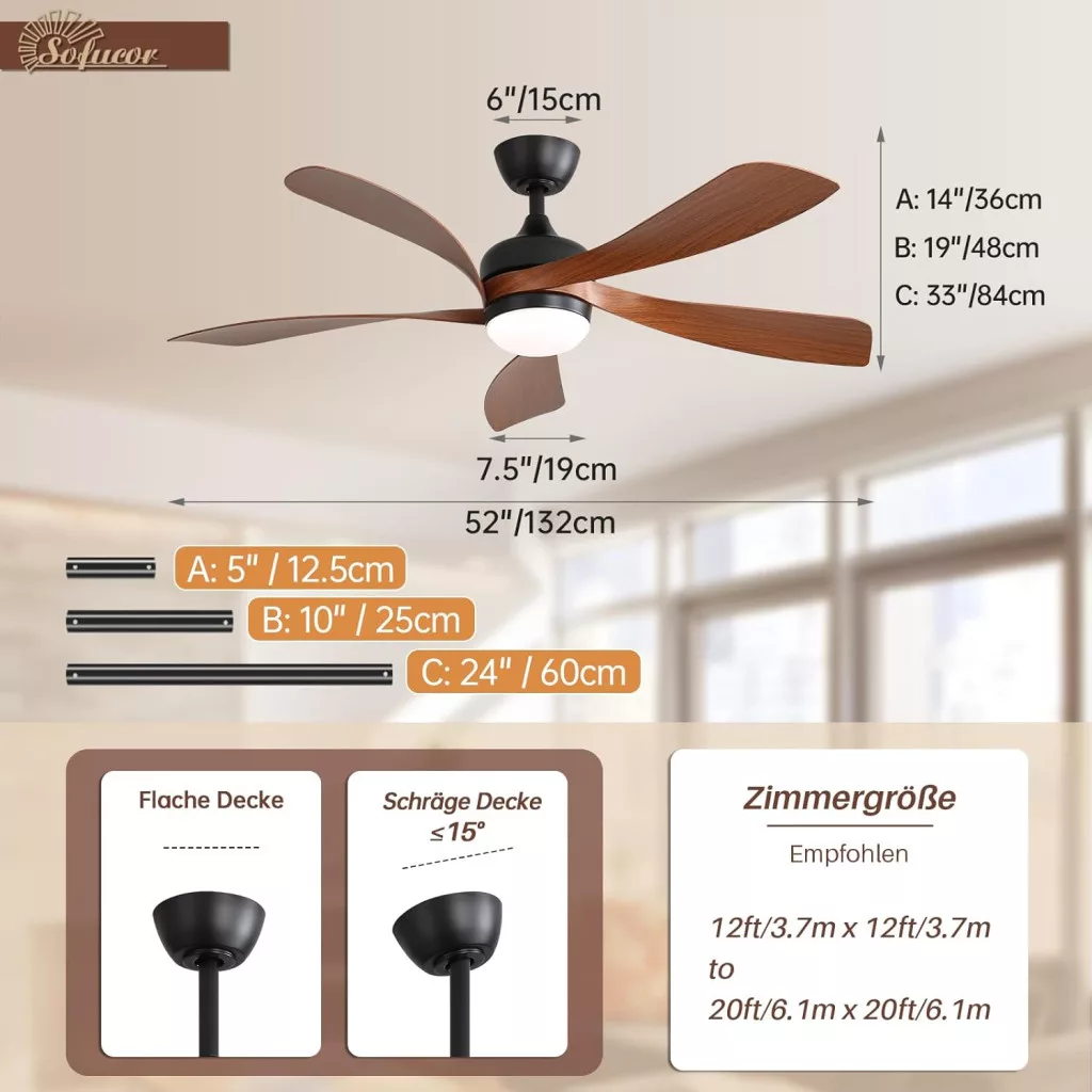 Stropný ventilátor Sofucor je moderné riešenie 2 v 1, ktoré spája účinné vetranie a elegantné LED osvetlenie. Ventilátor s priemerom 132 cm (52 palcov) je ideálnou voľbou do obývacích izieb, spální, kancelárií, a dokonca aj na zastrešené terasy. 5 lopatiek z materiálu ABS so svetlým vzorom dreva nie je len funkčným, ale aj dekoratívnym prvkom miestnosti. Ventilátor disponuje tromi závesnými tyčami rôznej dĺžky (12,5 cm, 25 cm, 60 cm) a funkciou náklonu 15 stupňov, vďaka čomu sa flexibilne prispôsobí každej miestnosti.