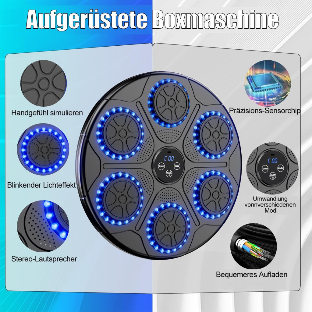 • RGB Fényjáték: Minden ütés szinkronban a zenével világít fel. Lenyűgöző vizuális élmény, amely az edzést szórakoztatóvá teszi.