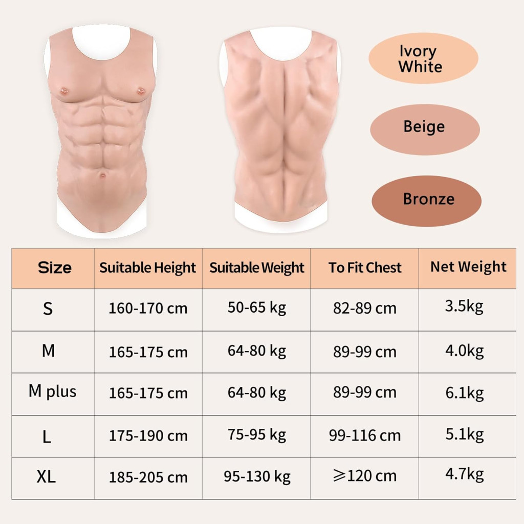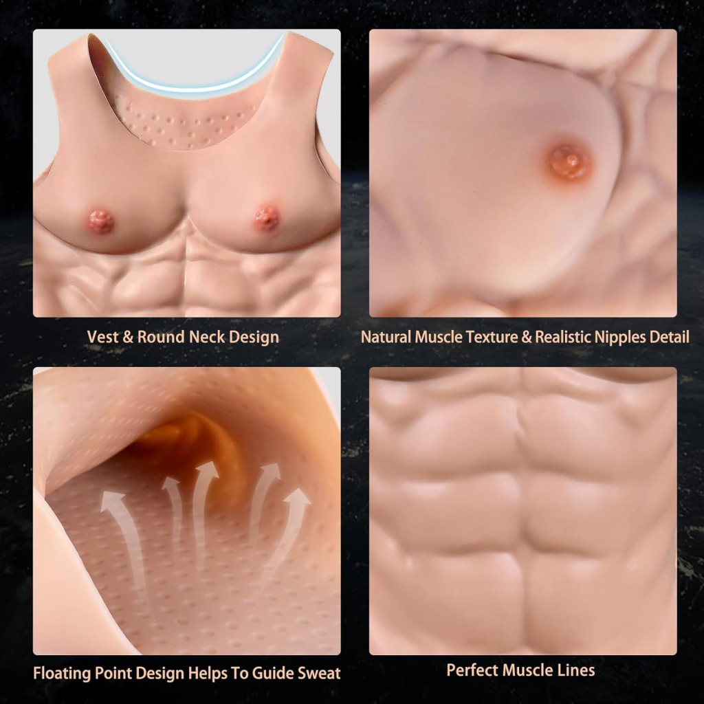 Silikónový chránič svalov YEEFAIRY je kostým vysokej kvality, ktorý zaisťuje realistický vzhľad bez potreby dlhého tréningu. 100% platinový silikónový materiál je mäkký, pružný a priateľský k pokožke, vďaka čomu je pohodlný aj pri dlhšom nosení. Dizajn vesty zaisťuje jednoduché obliekanie a vyzliekanie a možnosť diskrétneho nosenia pod oblečením.