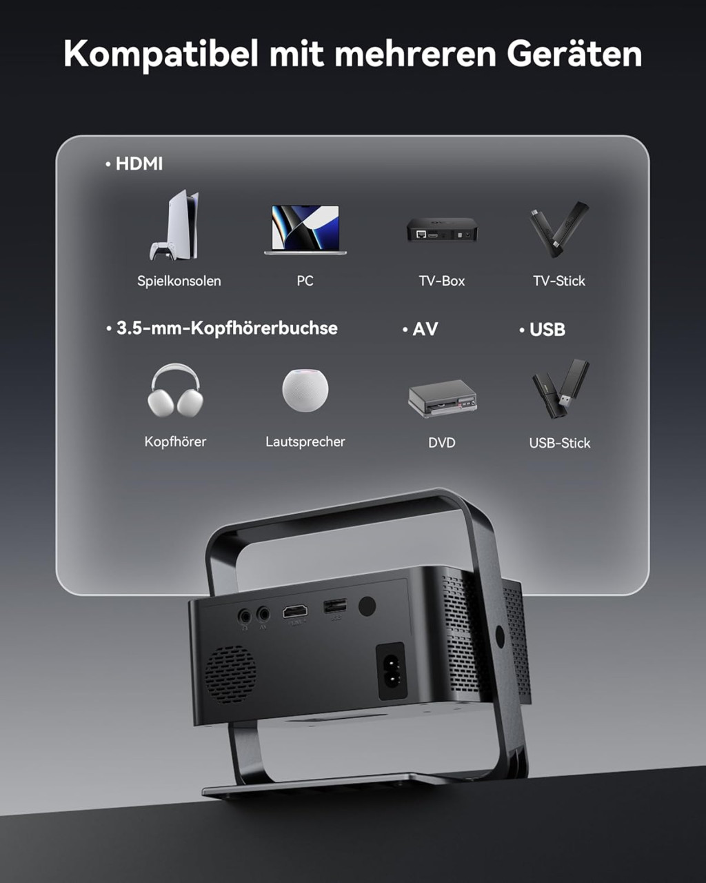 Projektor Polocsh P7 ponúka širokú škálu kompatibility s rôznymi zariadeniami a zdrojmi, takže si na ňom môžete vychutnať takmer akýkoľvek obsah. Viaceré možnosti pripojenia zaisťujú, že môžete ľahko pripojiť všetky svoje obľúbené zariadenia: