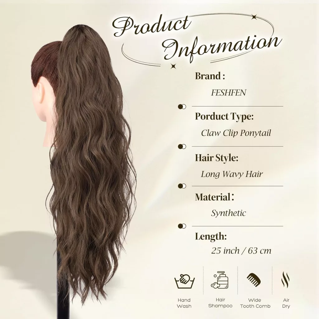 FESHFEN Ponytail Extensions je prémiové predĺženie vlasov, ktoré ponúka dokonalé riešenie pre tých, ktorí chcú zväčšiť dĺžku a objem svojich vlasov. Toto 63 cm dlhé vlnité predĺženie vlasov so štipcom sa ľahko nasadzuje aj dáva dole, vďaka čomu je ideálnou voľbou ako na bežné nosenie, tak aj na špeciálne príležitosti.