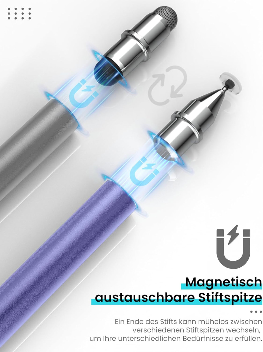 A MEKO érintőceruza egy innovatív megoldás azok számára, akik maximális rugalmasságot keresnek digitális eszközeik használatához. Ez a sokoldalú stylus három különböző tippel rendelkezik, amelyek mágneses csatlakozással könnyen cserélhetők. Akár jegyzeteléshez, rajzoláshoz vagy egyszerű navigációhoz használod, ez a ceruza minden helyzetben megállja a helyét. A szürke és lila színváltozatok elegáns megjelenést biztosítanak, amely bármely eszközhöz illik.