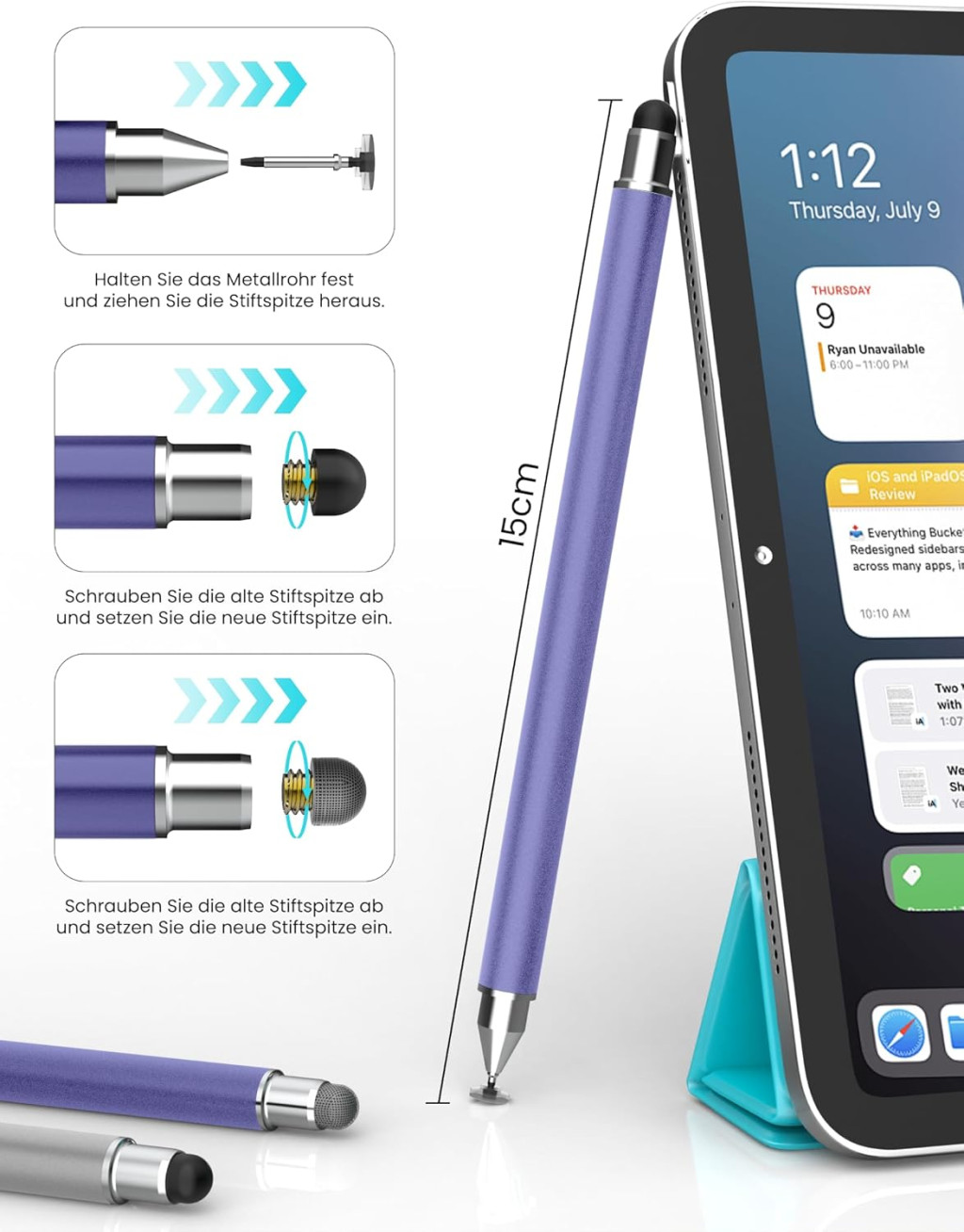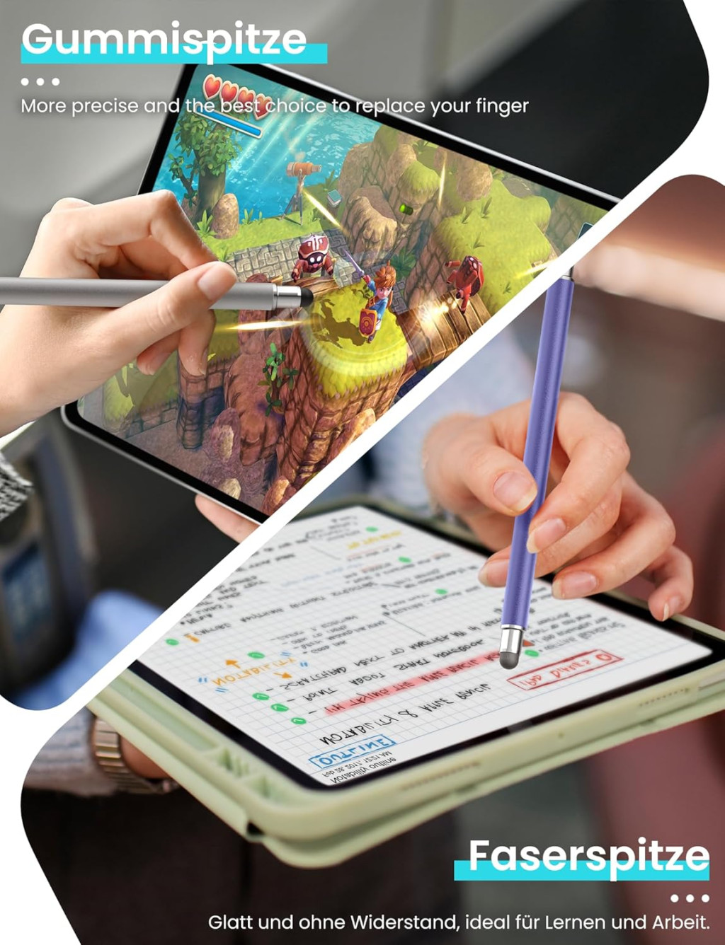 Ez az érintőceruza ideális választás különféle felhasználási módokhoz. A gumi tipp tökéletes helyettesítője az ujjnak – nem hagy nyomokat vagy ujjlenyomatokat az képernyőn, és kiváló a kis ikonok kattintásához vagy a weben való navigáláshoz. A szál tipp sima írási élményt nyújt, gyors válaszidővel, amely ideális jegyzeteléshez, rajzoláshoz és játékokhoz. Az átlátszó korong tipp pedig különösen hasznos azok számára, akiknek nagyobb az ujjuk vagy finommotoros nehézségeik vannak a kis okostelefonok billentyűzetén való gépeléskor.
