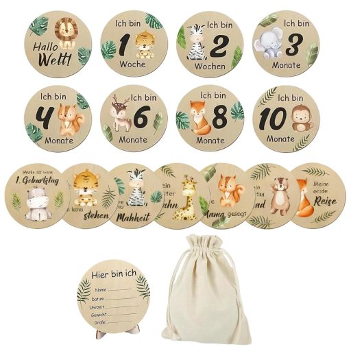 Táto úžasná 15-dielna sada míľnikových kartičiek je vyrobená z prírodného lakovaného dreva, ktoré dodáva kartičkám teplý a elegantný vzhľad. Každý drevený disk je jedinečný a potlačený farebnými zvieracími motívmi, ktoré označujú najdôležitejšie momenty vývoja bábätka. Prvý úsmev, prvé zúbky, prvé slovo a prvé krôčiky – každý z týchto okamihov môžete zvečniť pomocou týchto krásnych kartičiek. Sada je dokonalým darčekom pre novorodencov, na krstiny alebo na „baby shower“ oslavy a pomáha rodičom zdokumentovať tie najkrajšie momenty vývoja ich dieťaťa.