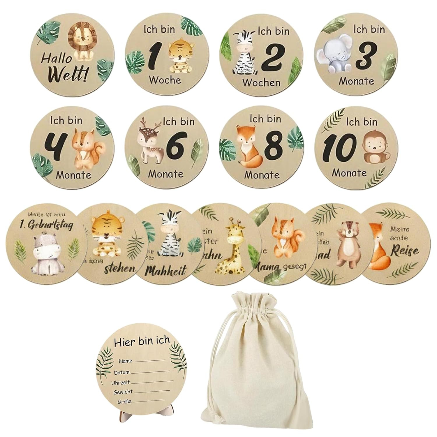 FDHBDF 15 ks drevených míľnikových kartičiek s motívom farebných zvieratiek na zaznamenanie spomienok bábätka