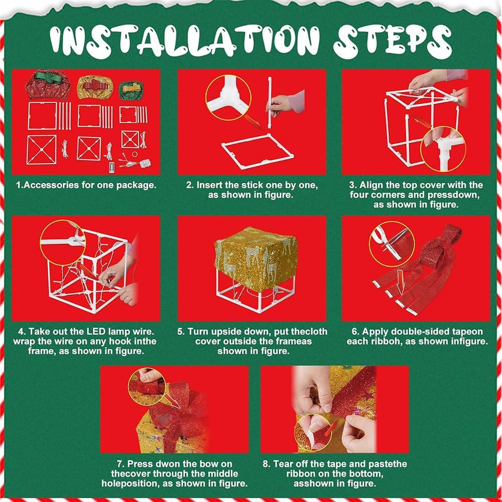 Výrobok je mimoriadne užívateľsky prívetivý. Darčekové škatule pozostávajú z pevného plastového rámu, ktorý je odolný a len tak sa nepoškodí. Montáž je jednoduchá: zostavíte rám a naň navlečiete vianočnú látku so vzorom. Ak sa nepoužívajú, dajú sa ľahko rozobrať a uložiť do pôvodnej škatule, čím ušetríte miesto. Funkcia časovača umožňuje nastaviť čas vypnutia, takže sa nemusíte obávať, že zabudnete svetlá vypnúť. Diaľkové ovládanie sa ľahko používa a sú na ňom dostupné všetky funkcie.