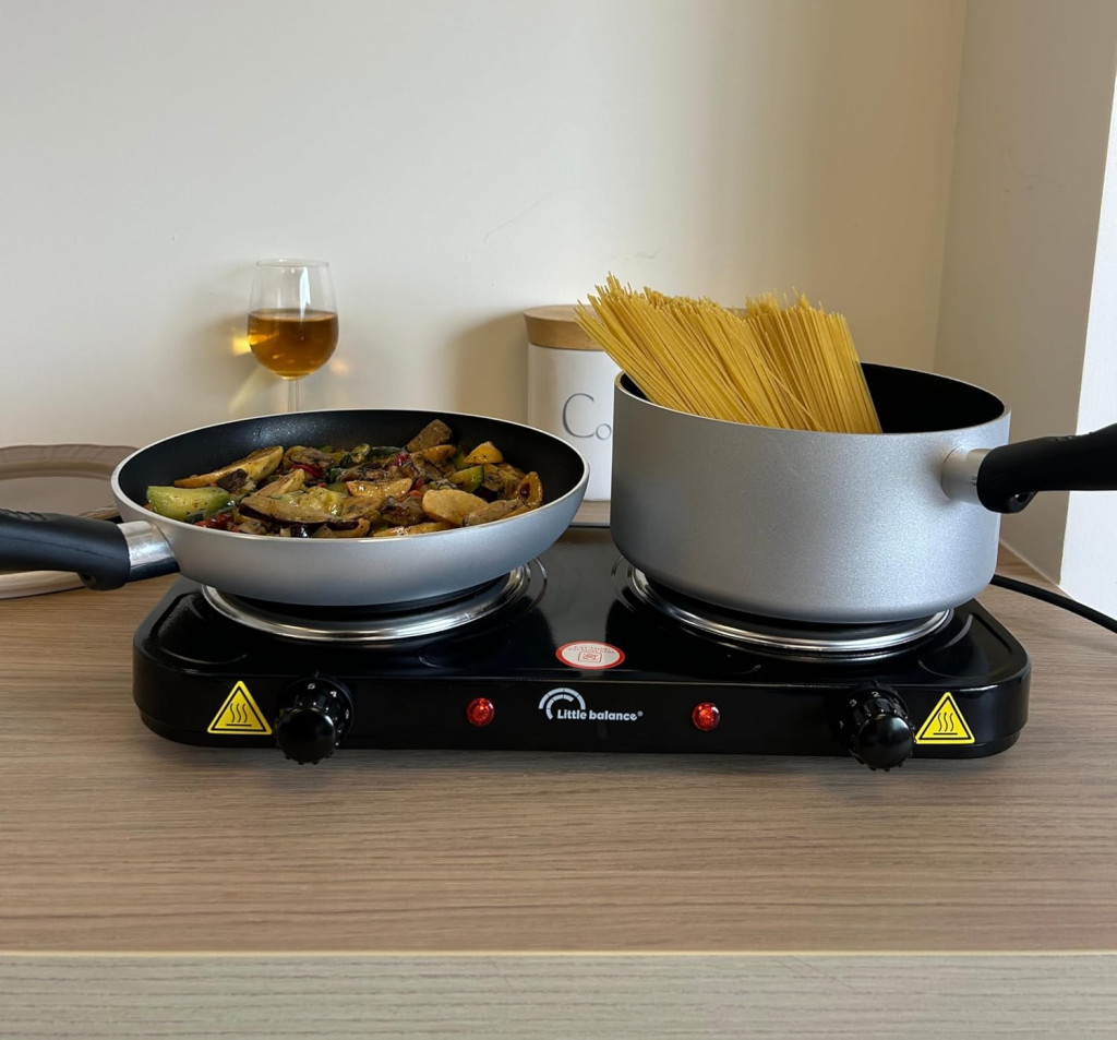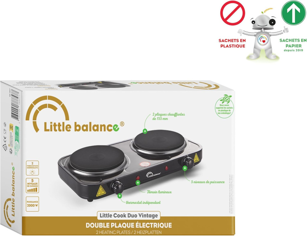 A LITTLE BALANCE LITTLE COOK DUO VINTAGE egy ultramodern, kompakt elektromos kétlemezes főzőlap, amely tökéletes megoldás azoknak, akik kis helyiségben, diákszállón, irodában vagy kempingezéskor szeretnének főzni. Ez a könnyű és hordozható készülék mindössze 2,45 kilogramm súlyú, így bárhova magával vihető. Az elegáns vintage design és a praktikus funkciók kombinációja ezt a terméket ideális választássá teszi a modern, mobil életmódot élőknek.