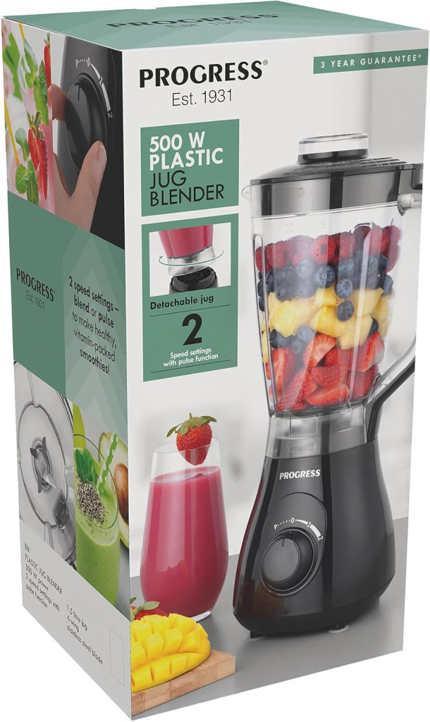 A Progress Plastic 1.5 L Jug Mixer egy megbízható és praktikus turmixgép, amely tökéletes választás azoknak, akik keresnek egy jó minőségű, megfizethető megoldást a mindennapi konyhai feladatokhoz. Az 500 wattos teljesítmény, a 2 sebesség és a pulzus funkció biztosítja a rugalmasságot, míg a rozsdamentes acél pengék garantálják a tartósságot. A nagy 1.5 literes kancsó és az eltávolítható alkatrészek könnyű tisztítást és tárolást tesznek lehetővé. Bár nem rendelkezik a prémium modellek összes funkciójával, az ár-érték arány kiváló, és a 3 év garancia további biztonságot nyújt. Ajánlott mindazoknak, akik szeretnek friss smoothie-kat, leveseket és egyéb italokat készíteni.
