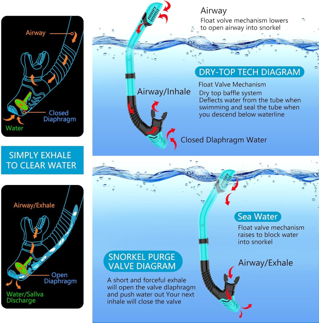 - Potápanie na Nádych: Systém suchého šnorchla je ideálny na krátke ponory, pretože pri návrate nemusíte trubicu vyprázdňovať.