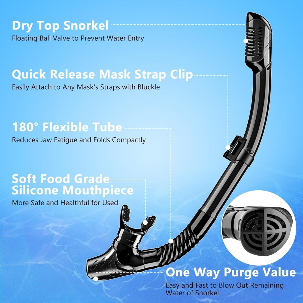 - Systém Suchého Šnorchla: Plávajúca guľa na vrchu šnorchla automaticky uzatvára trubicu pri ponorení pod vodu, čím zabraňuje vniknutiu vody do dýchacej trubice.