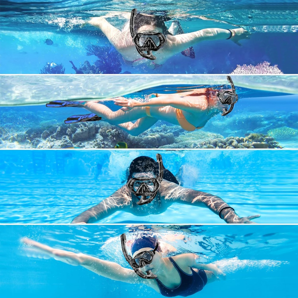 - Ergonomický Dizajn: Maska má mäkké rebrované silikónové tesnenie, ktoré pohodlne sedí na tvári a účinne zabraňuje vniknutiu vody.
