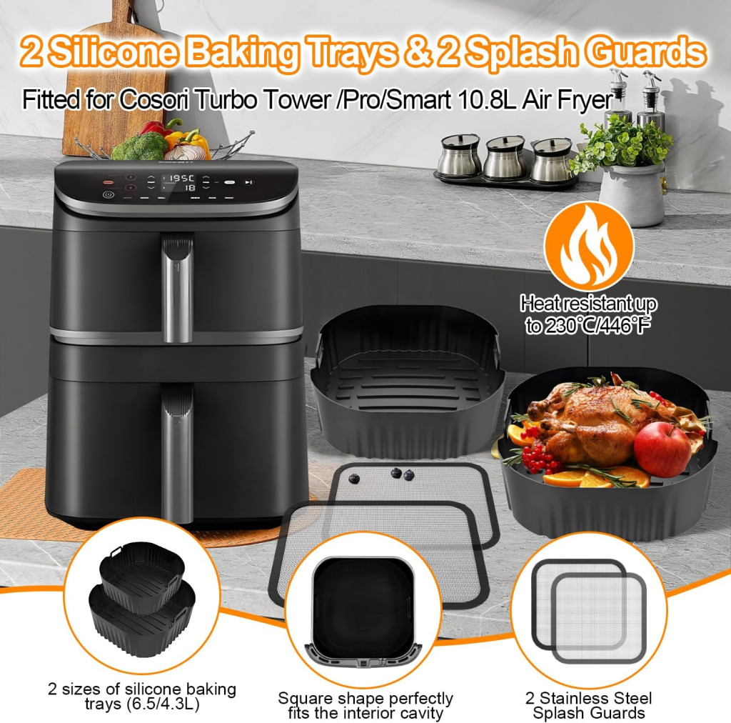 Ez a speciálisan tervezett 4 részes kiegészítő szett a Cosori Turbo Tower Pro/Smart 10.8L légfriteuszhoz készült. A szett két különböző méretű szilikon sütőformát (6,5L és 4,3L) és két mágneses rozsdamentes acél fröccsenésvédőt tartalmaz, amelyek tökéletesen illeszkednek a készülék belsejéhez. Az összes alkatrész precíz méretezésű, hogy biztosítsa az egyenletes légkeringést és az optimális sütési eredményeket, miközben maximálisan kihasználja a friteusz tágas belsejét.