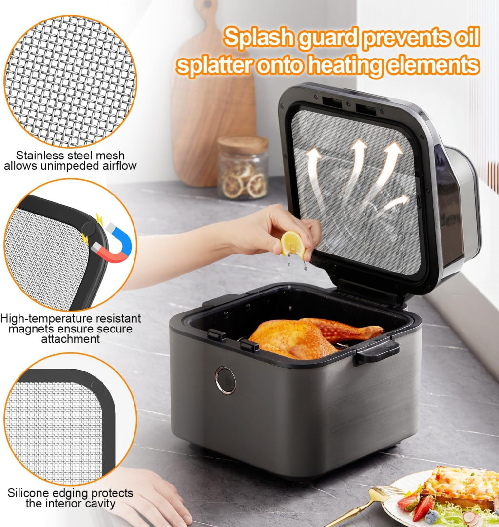 - Mágneses fröccsenésvédők: Rozsdamentes acél testtel és szilikon szélekkel, amelyek megakadályozzák a zsír és ételmaradékok fröccsenését a fűtőelemre. A szilikon szél védi a kezeket és a friteuszt.