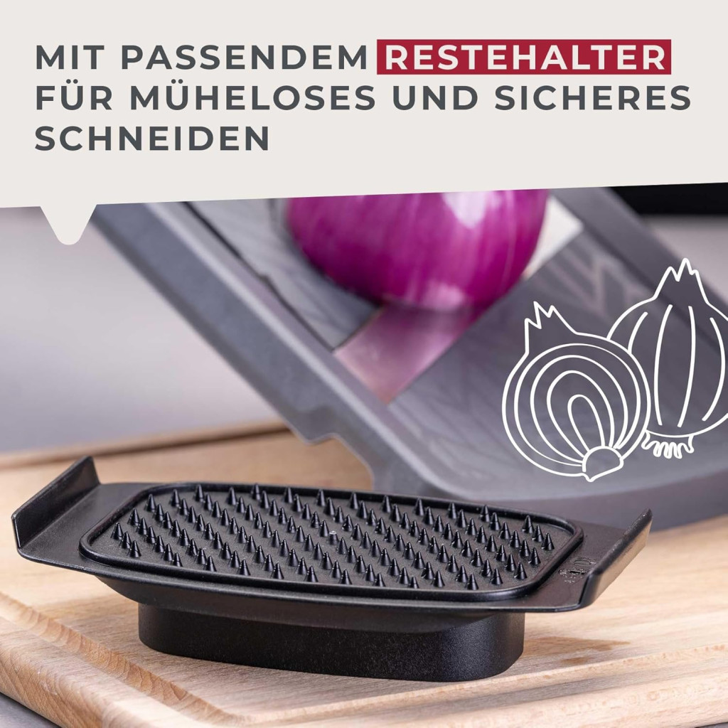 A mandolin típusú vágó 4 fokozatú beállítási lehetőséggel rendelkezik, amely lehetővé teszi a különböző vastagságú szeleteket. Az ergonomikus csúsztatóval és a biztonsági maradék tartóval a vágás nem csak gyorsabb, hanem sokkal biztonságosabb is lesz. A termék könnyű karbantartása és hosszú élettartama garantálja, hogy hosszú évekig megbízható segítőtársa lesz a konyhában.