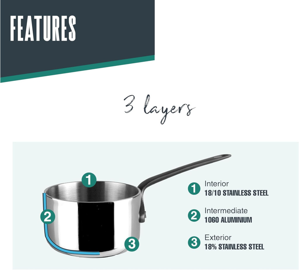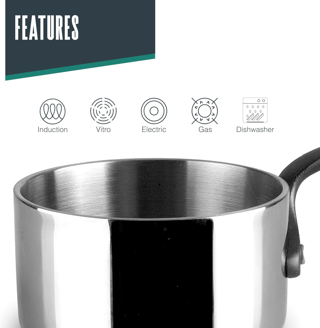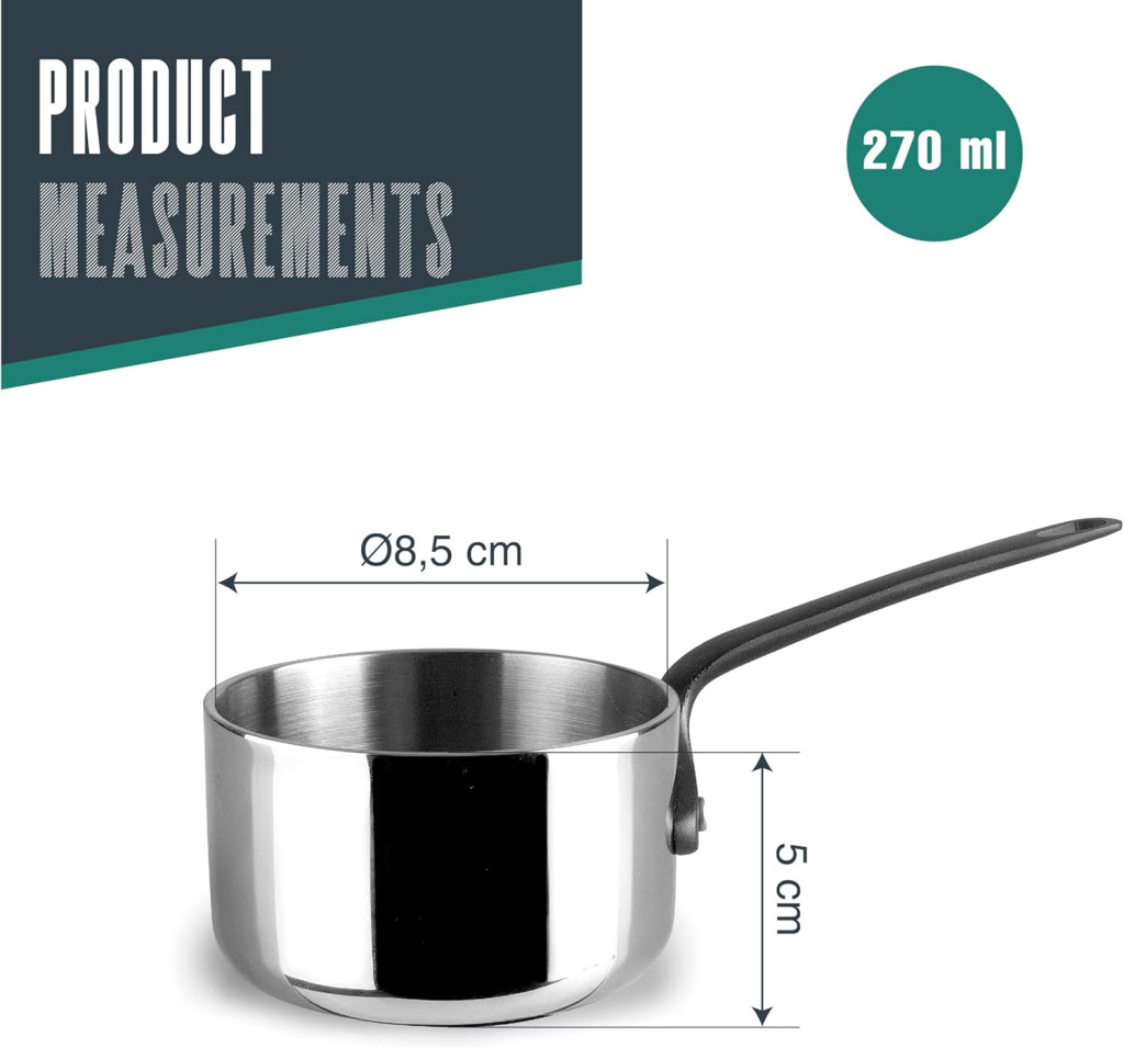 Ez a mini edény ideális választás számos konyhai feladathoz. Tökéletes szószkészítéshez, mártások melengéséhez, csokoládé olvasztásához és egyéb precíz hőkezelést igénylő feladatokhoz. A 270 ml kapacitás elegendő kis adagok kezeléséhez, míg az egyenletes hőeloszlás biztosítja, hogy az étel nem éghet meg vagy nem marad nyersen.