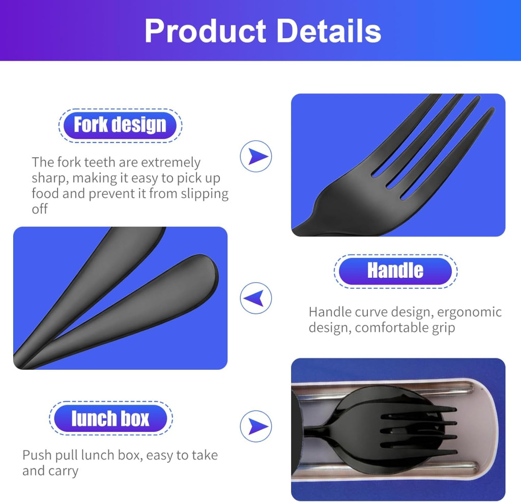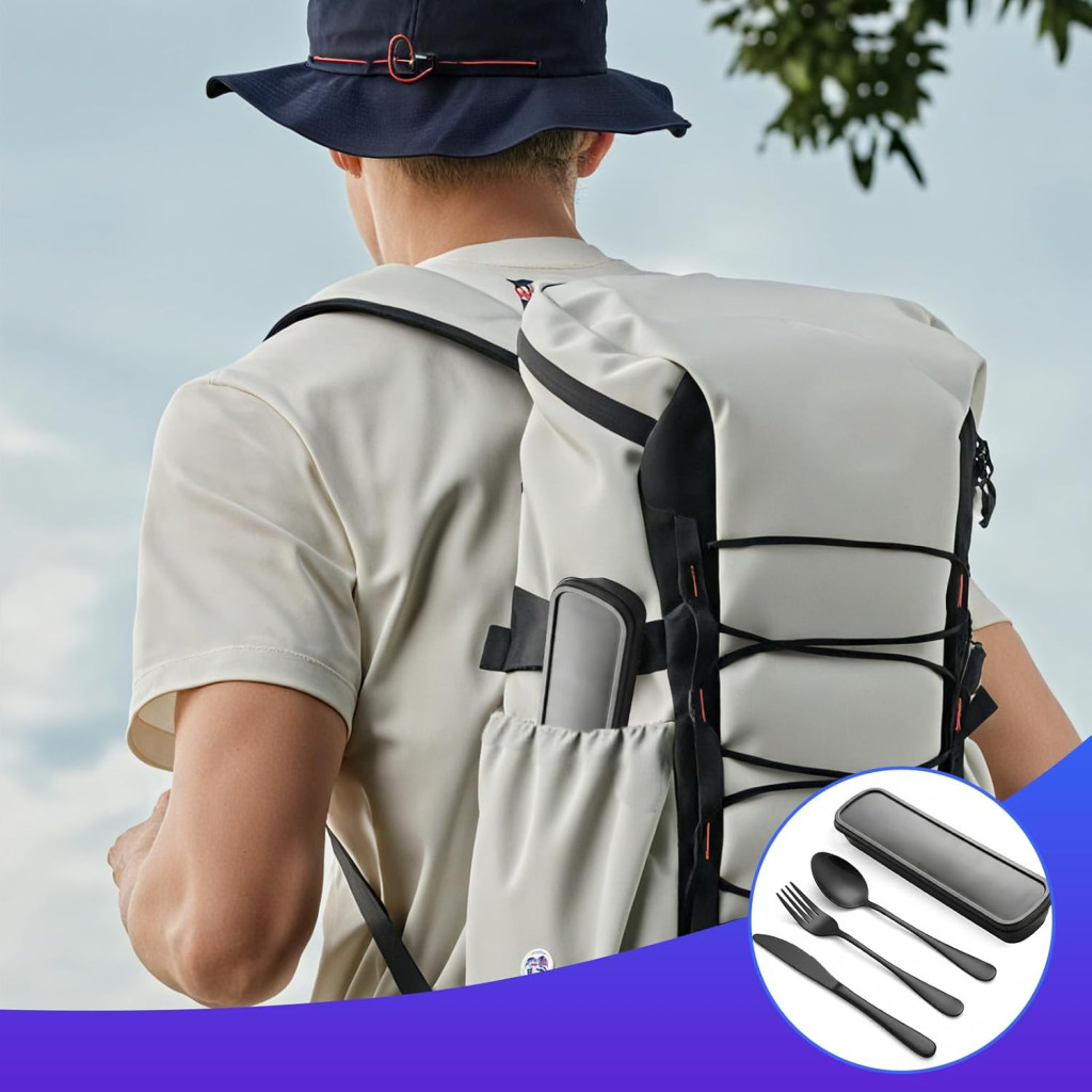 Az evőeszközök magas minőségű, élelmiszer-biztonságos rozsdamentes acélból készülnek, amely garantálja a tartósságot és a kényelmes használatot. A sima élek biztosítják a kellemes étkezési élményt, míg az erősített táska biztonságosan védi az evőeszközöket a hátizsákban, kézitáskában vagy bőröndben.